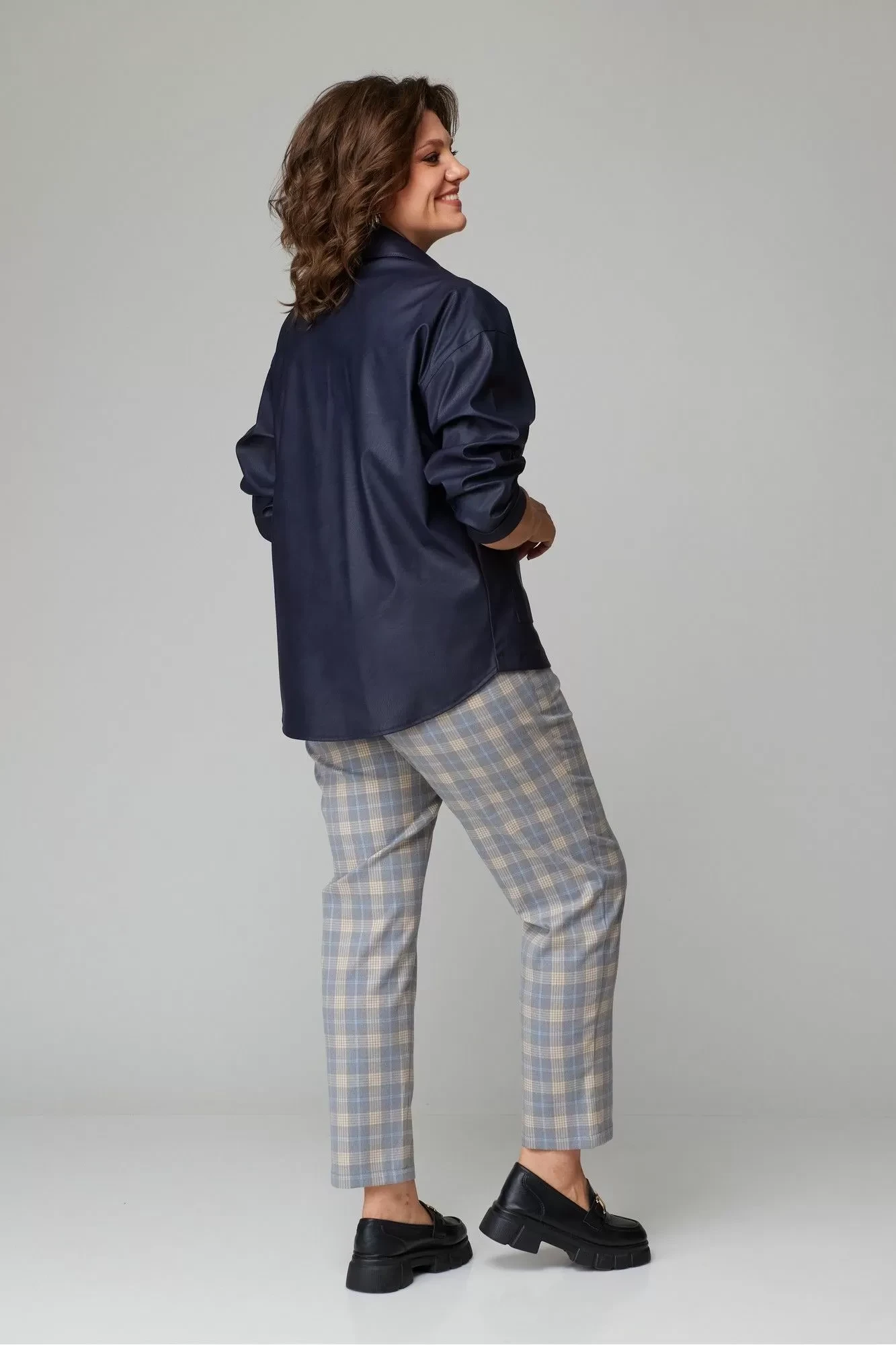 Модный комплект нового сезона: кожаная рубашка и брюки. Кожаная рубашка, выполнена из высококачественной эко-кожи на вискозной основе, прямого свободного силуэта. Низ изделия фигурный, спинка по отношению к переду слегка удлинена. По переду центральная застежка на кнопки и накладные карманы с клапанами. Горловина округлая с втачным воротником-стойкой рубашечного типа. Спинка цельная, линия плеча приспущена. Рукав втачной длинный, по низу рукава расположены шлёвки с декоративной завязкой, которая позволяет фиксировать нужный объём . Брюки прямые, свободного силуэта, немного заужены к низу с классической посадкой на талию, по переду застежка гульфик на молнию. Пояс притачной с застежкой на петлю-пуговицу, по задней части частично вставлена эластичная тесьма-резинка, по всей длине пояса расположены шлевки. На передних половинах выполнены наклонные карманы от боковых швов, на задних частях брюк имитация карманов в виде декоративных листочек. Эффектный стильный костюм весьма многофункционален так как отлично будет сочетаться и с другими предметами гардероба.