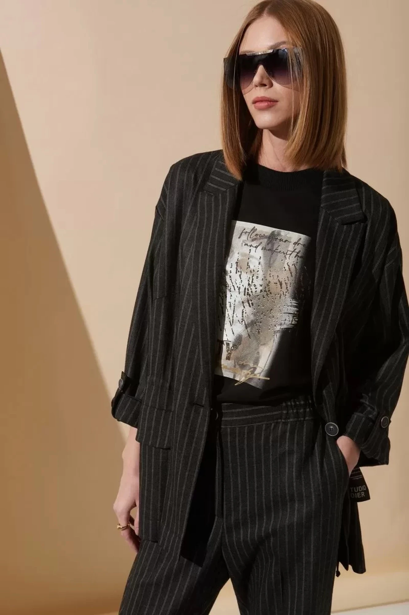 Костюм женский из тонкой костюмной ткани, состоящий из свободного жакета с кулисой по талии и классических брюк с эластичной тесьмой в поясе.