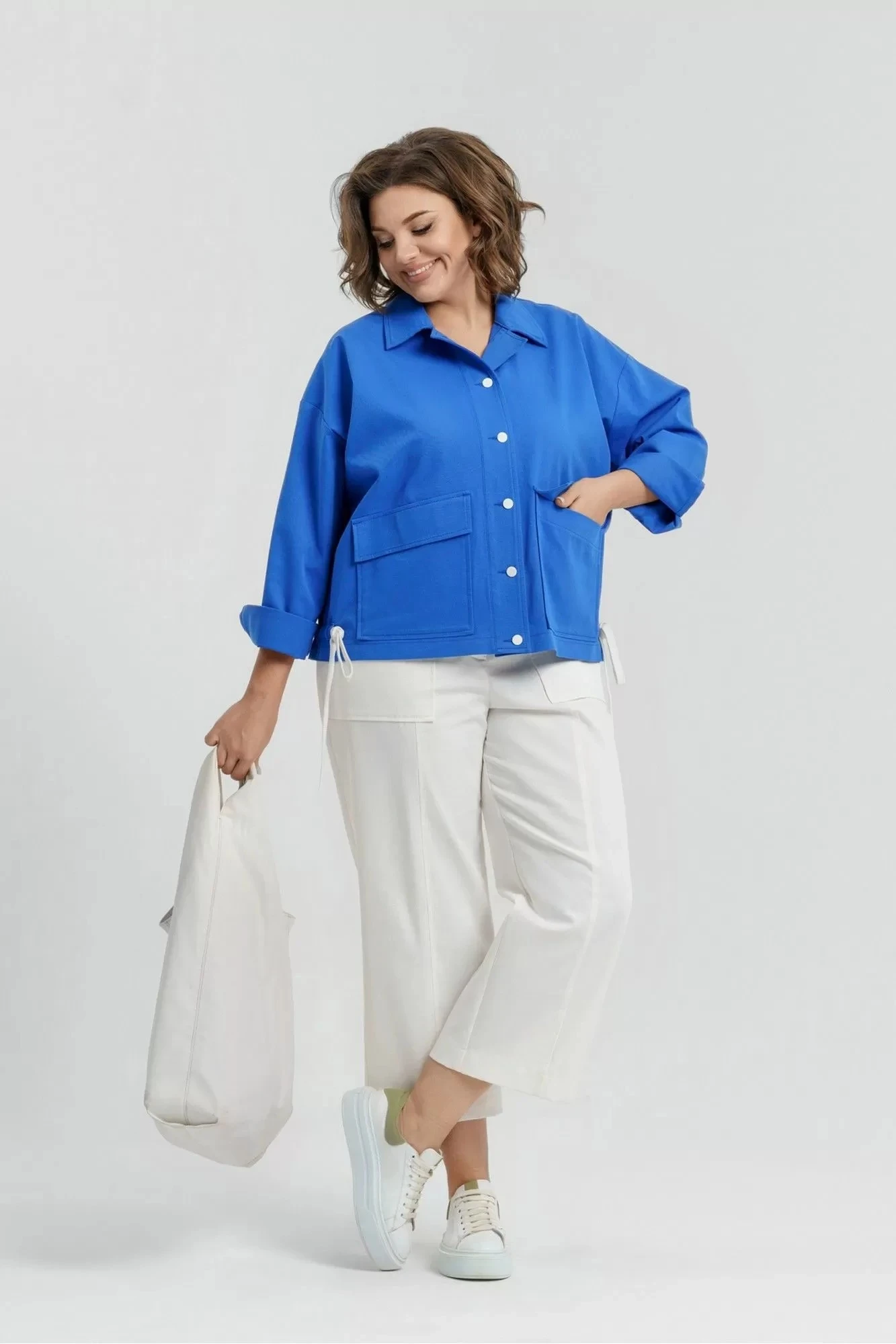 Комплект женский двухпредметный. Жакет -джуд прямого силуэта без подкладки из джинсовой ткани. Отложной воротник, застежка- планка на петли и пуговицы. Рукав отрезной на базе цельнокроеного с манжетой по низу. По переду накладные карманы с клапанами. На спинке по низу жакета кулиса с декоративным шнуром. Длина по спинке - 59 см, длина рукава от горловины - 74 см. Брюки длиной 7/8 свободного покроя из хлопкового джинса, прямые. По переду декоративный шов с отстрочкой, два накладных кармана и один карман сзади. Пояс- отрезной с эластичной тесьмой, застежка на молнию и петлю с пуговицей. Длина с учетом пояса - 95 см.