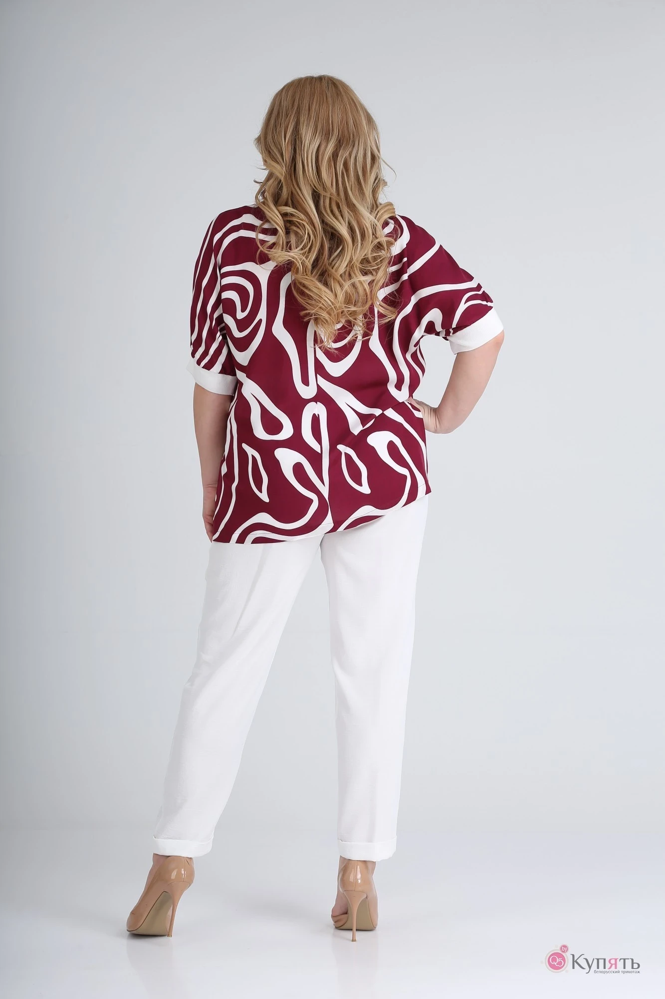 Блузон прямого силуэта, линия плеча спущена, рукав втачной одношовный,с притачным манжетом(довяз) по низу.По переду по горловине заложена встречная складка. По боковым швам разрезы. По спинке средний шов. Брюки: прямые, с застёжкой на тесьму-молнию и пуговицу. Верхний срез обработан поясом с резинкой. В боковых швах обработаны карманы.
