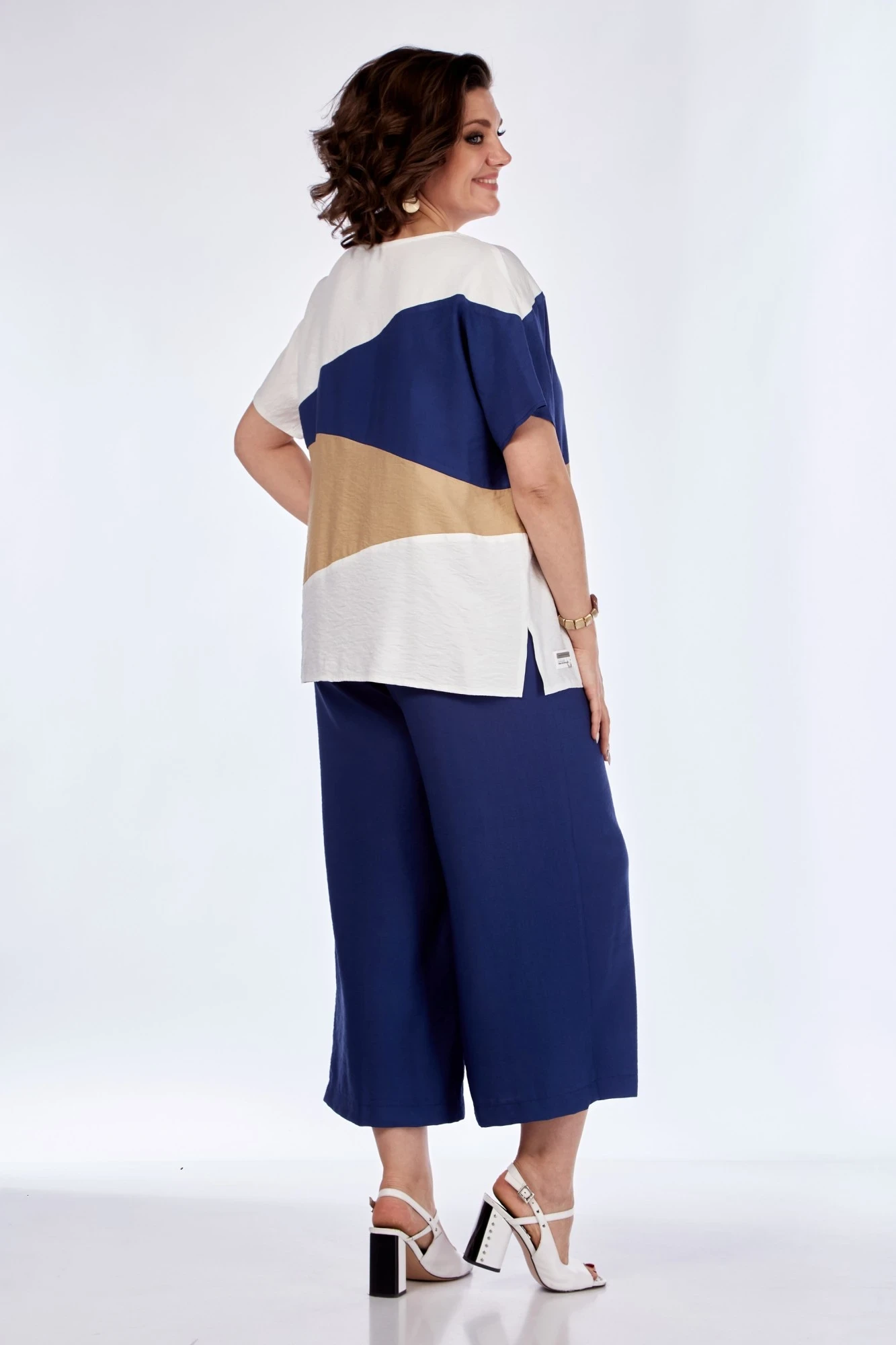 Комплект брючный: блуза+кюлоты. Блуза выполнена из 4-х цветов ткани. Перед и спинка с тремя волнообразными подрезами. Блуза с цельнокройным рукавом со спущенной линией плеча. В боковых швах обработаны разрезы.Брюки- кюлоты с застёжкой "молния" спереди. На кокетке сзади. Пояс притачной , сзади на резинке.