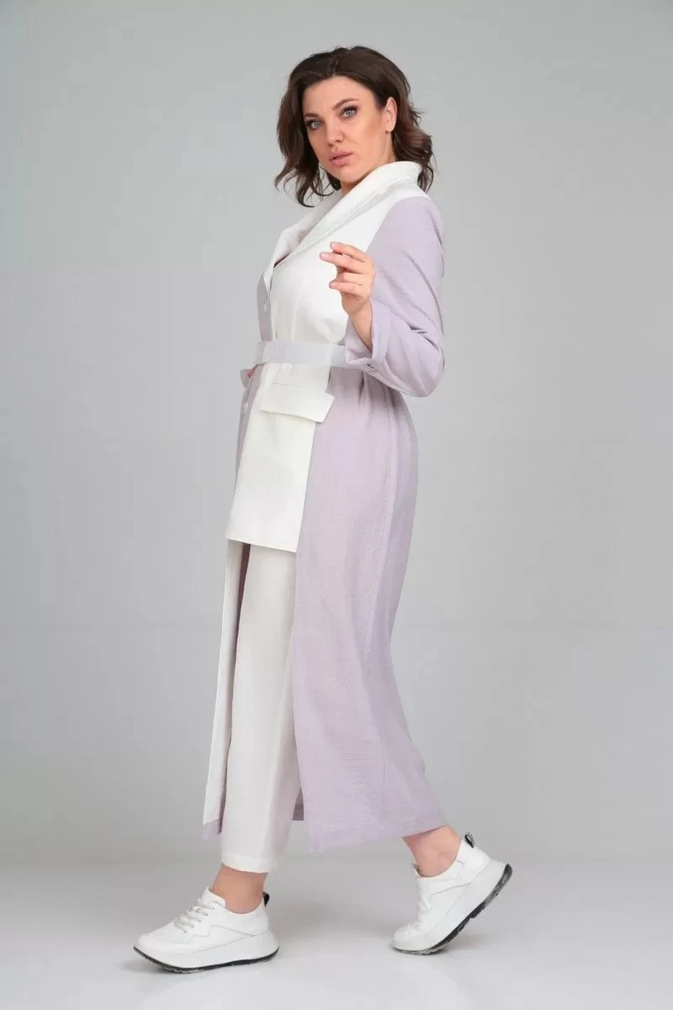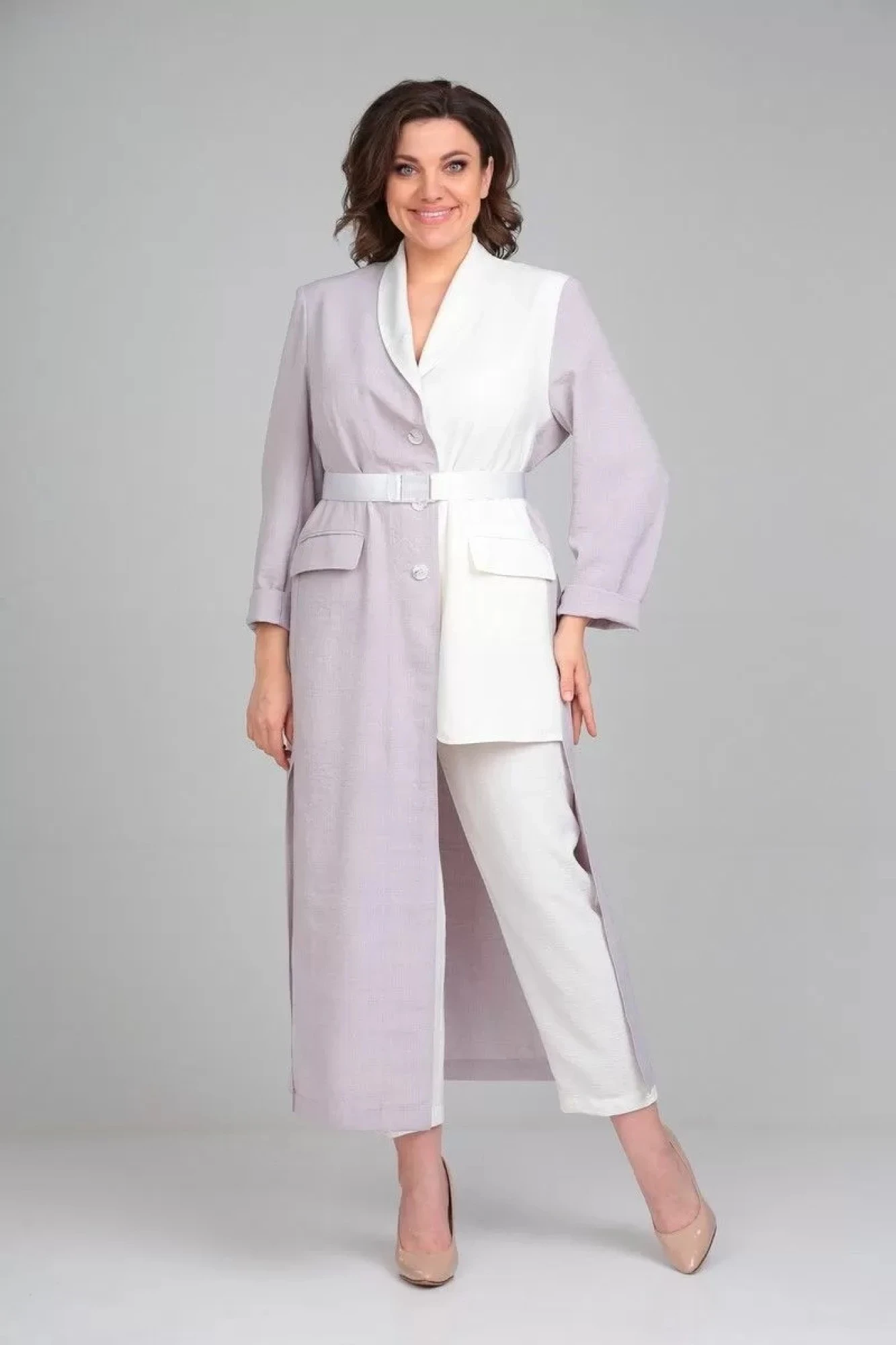 Комплект брючный (жакет+брюки). Жакет полуприлегающего силуэта с центральной застёжкой на петли и пуговицы. По спинке средний шов,бочки, по переду талиевые вытачки,обработаны прорезные карманы с обтачками и клапаном.Рукав втачной двушовный. Воротник - шалиевый. Брюки зауженные к низу, верхний срез обработан поясом с резинкой,застёжка на тесьму-молнию, петлю и пуговицу. В боковых швах обработаны карманы. В качестве отделки используется фурнитура и отделочные детали(съёмный пояс).
