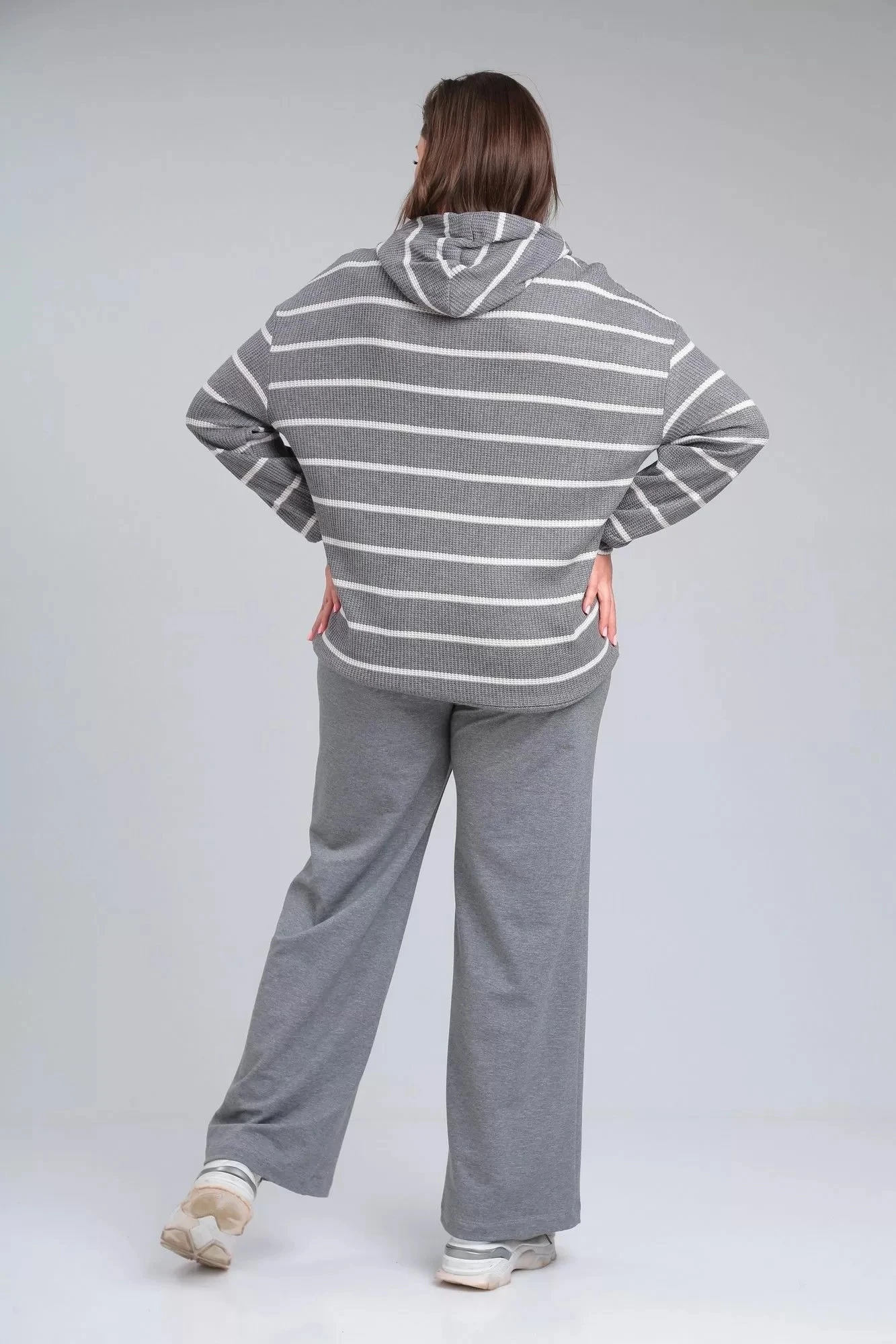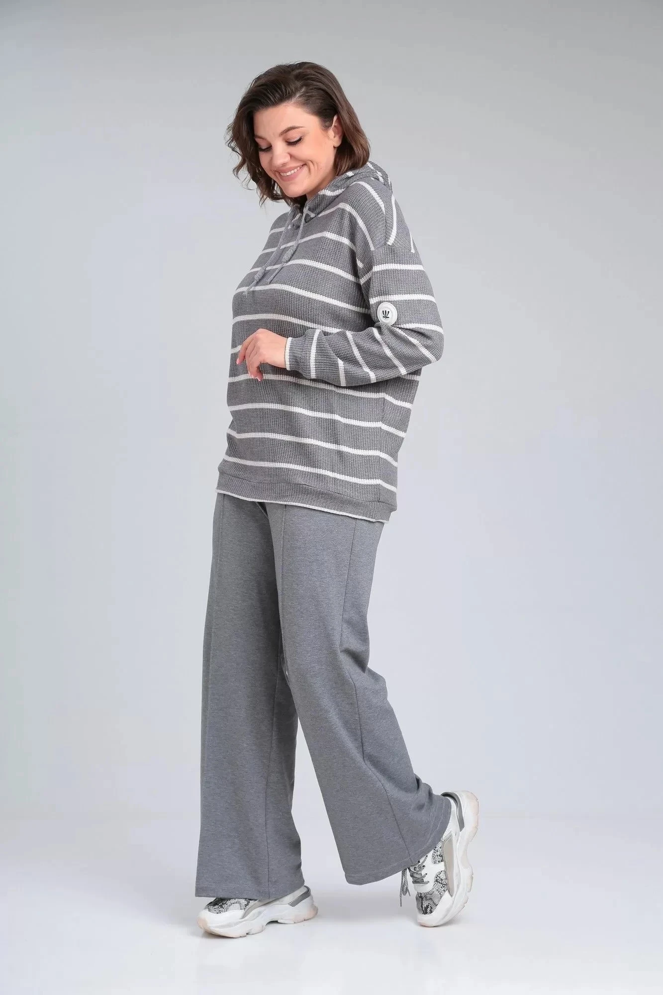 Комплект брючный:кофта +брюки.Кофта прямого силуэта с втачным рукавом. По низу рукава и кофты приталенные манжеты. Капюшон со средним швом, фиксируется шнурком. Брюки расширенные к низу. Пояс на резинке. На передних половинах застрочены стрелки.