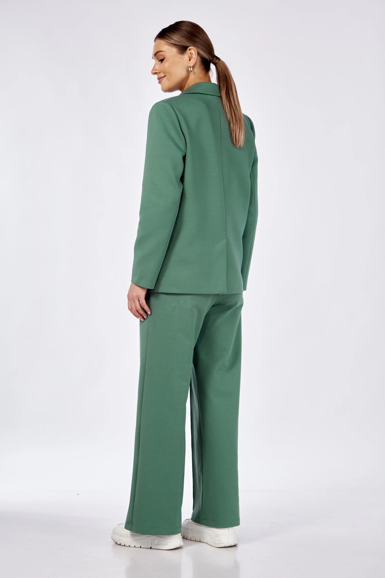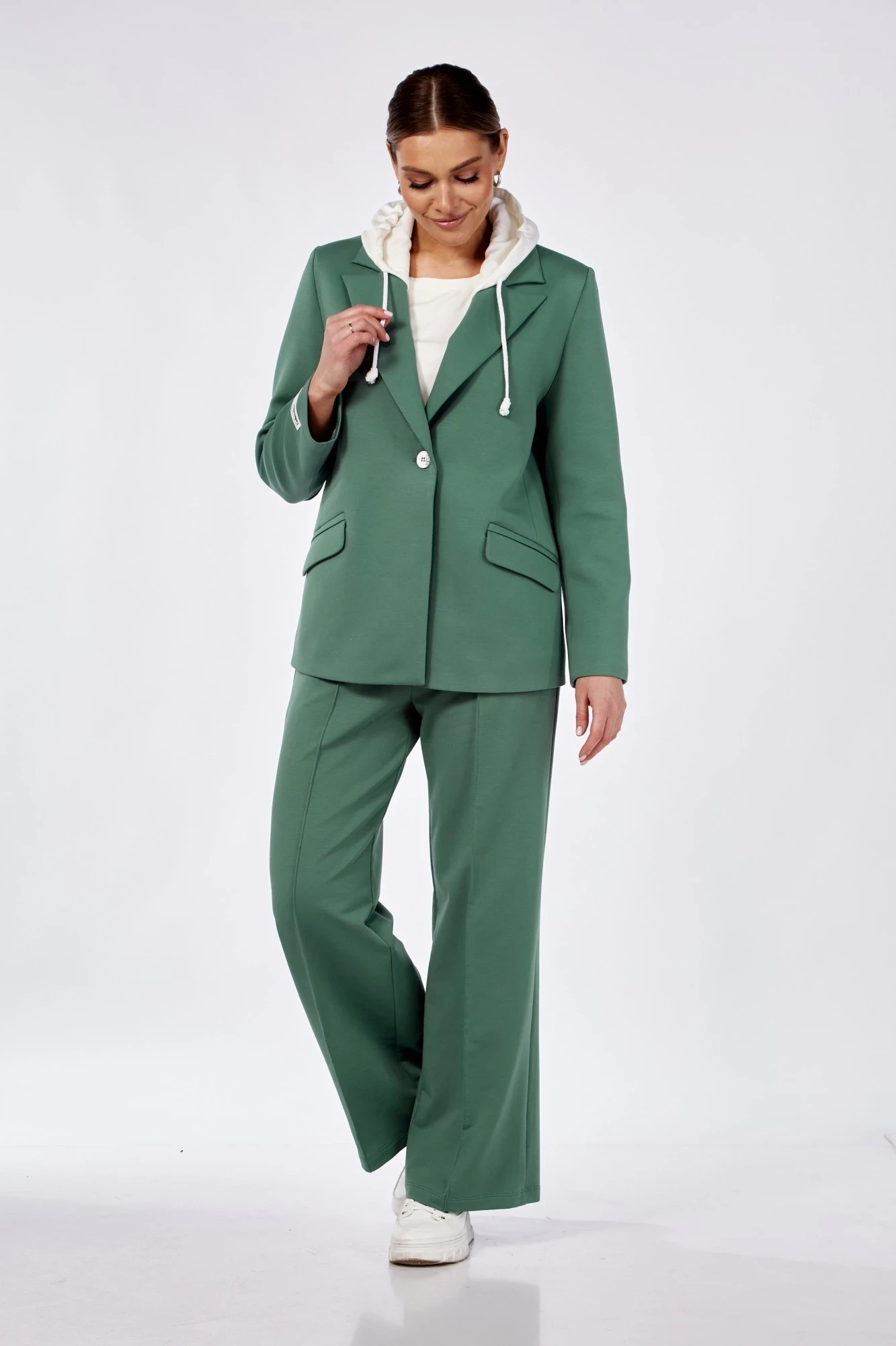 Комплект брючный:кофта +брюки+блузон. Жакет полуприлегающего силуэта с центральной застежкой на петлю и пуговицу. По спинке средний шов со шлицей, прорезные карманы с клапаном и обтачками. Рукав втачной. Воротник стояче-отложной с отрезной стойкой, лацканы с открытыми бртами. Капюшон съемный. Блузон полуприлегающего силуэта, рукав втачной одношовный, короткий. Брюки прямые, верхний срез обработан поясом с резинкой, по переду застрочены стрелки. В качестве отделки используется фурнитура.