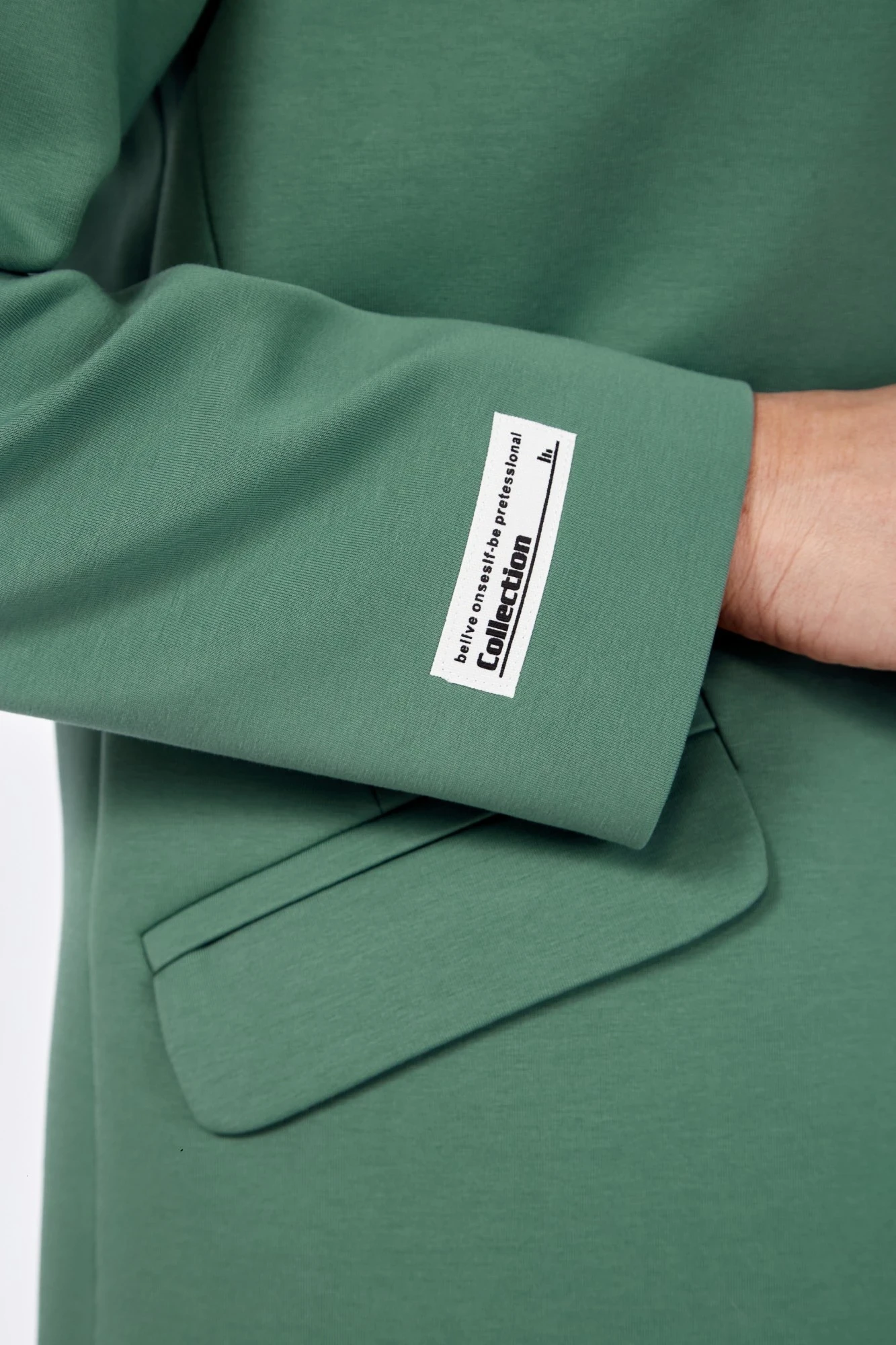 Длина жакета по спинке 68-70 см, длина рукава 63 см. Длина блузона по спинке 58-60 см, длина рукава 23 см.Длина брюк 105 см.