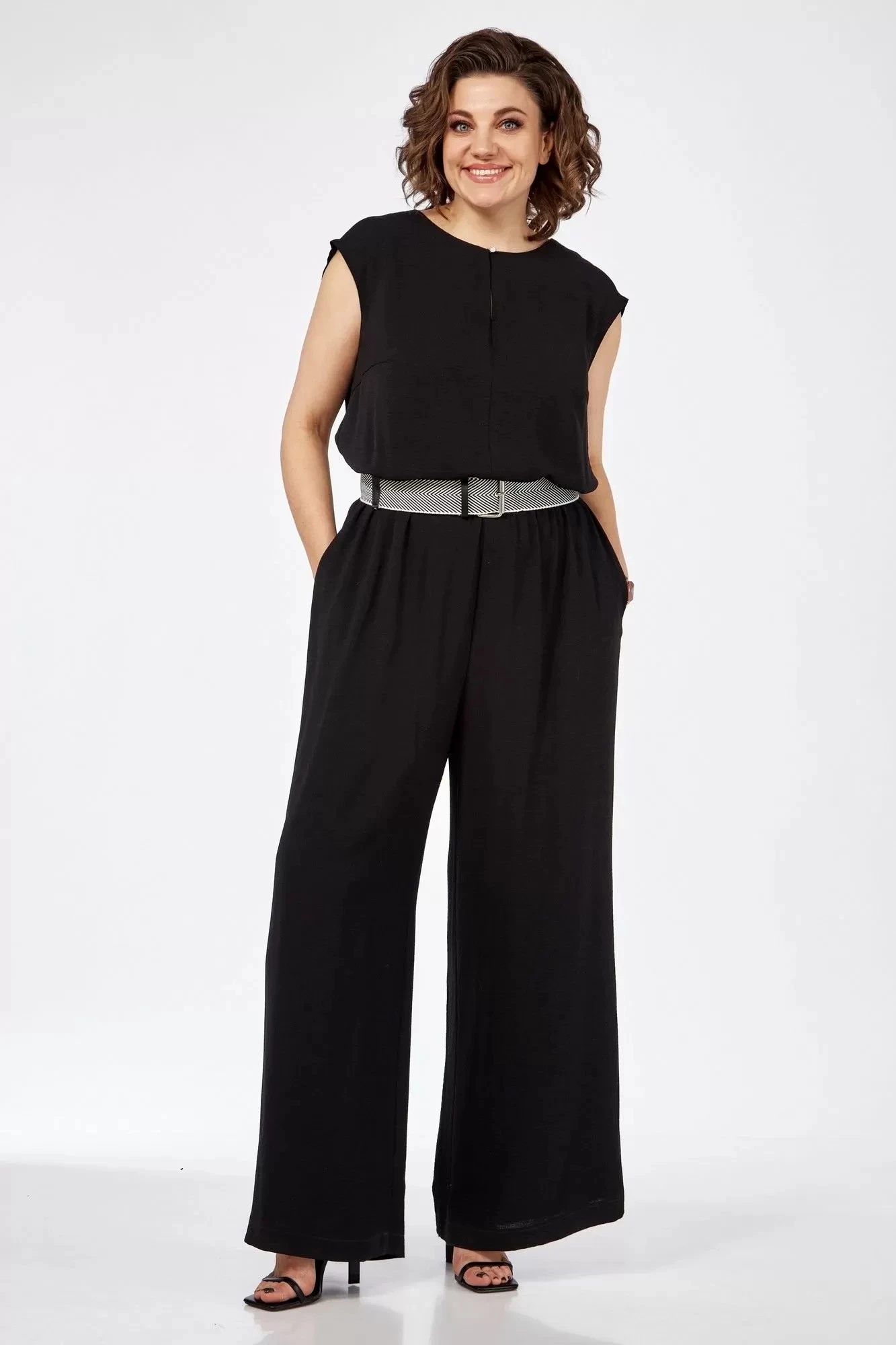Комплект женский состоит из комбинезона и жакета. Комбинезон свободного кроя с застежкой на поясную петлю и пуговицу и на спинке, и спереди. Верхняя часть с нагрудными вытачками. Нижняя часть с боковыми карманами в швах. В области талии резинка. Жакет свободного кроя с застежкой на петлю и пуговицу. Рукав одношовный со спущенной линией плеча. Воротник пиджачного типа.Пояс в комплекте.