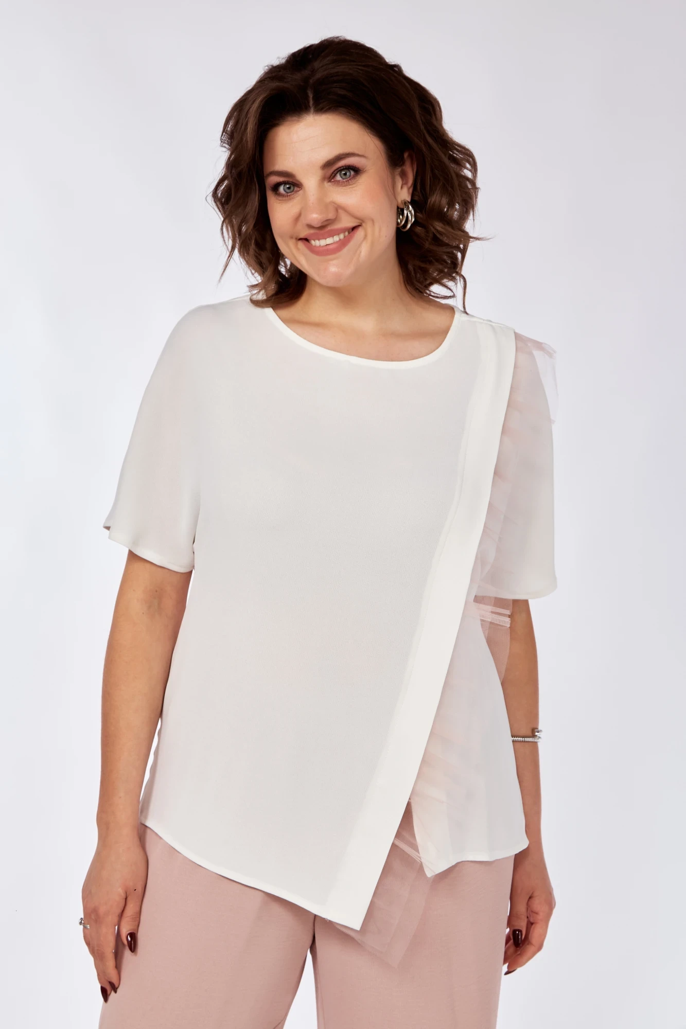 Комплект брючный состоит из блузы и брюк. Блуза свободного кроя с спущенной линией плеча и ассиметричным низом. Перед с косой складкой от левого плеча до низа, из-под которого выходит двойная рюша из фатина. Спинка с косой складкой от левого плеча до низа. Горловина округлой формы. Брюки прямые свободного кроя, сверху на резинке.