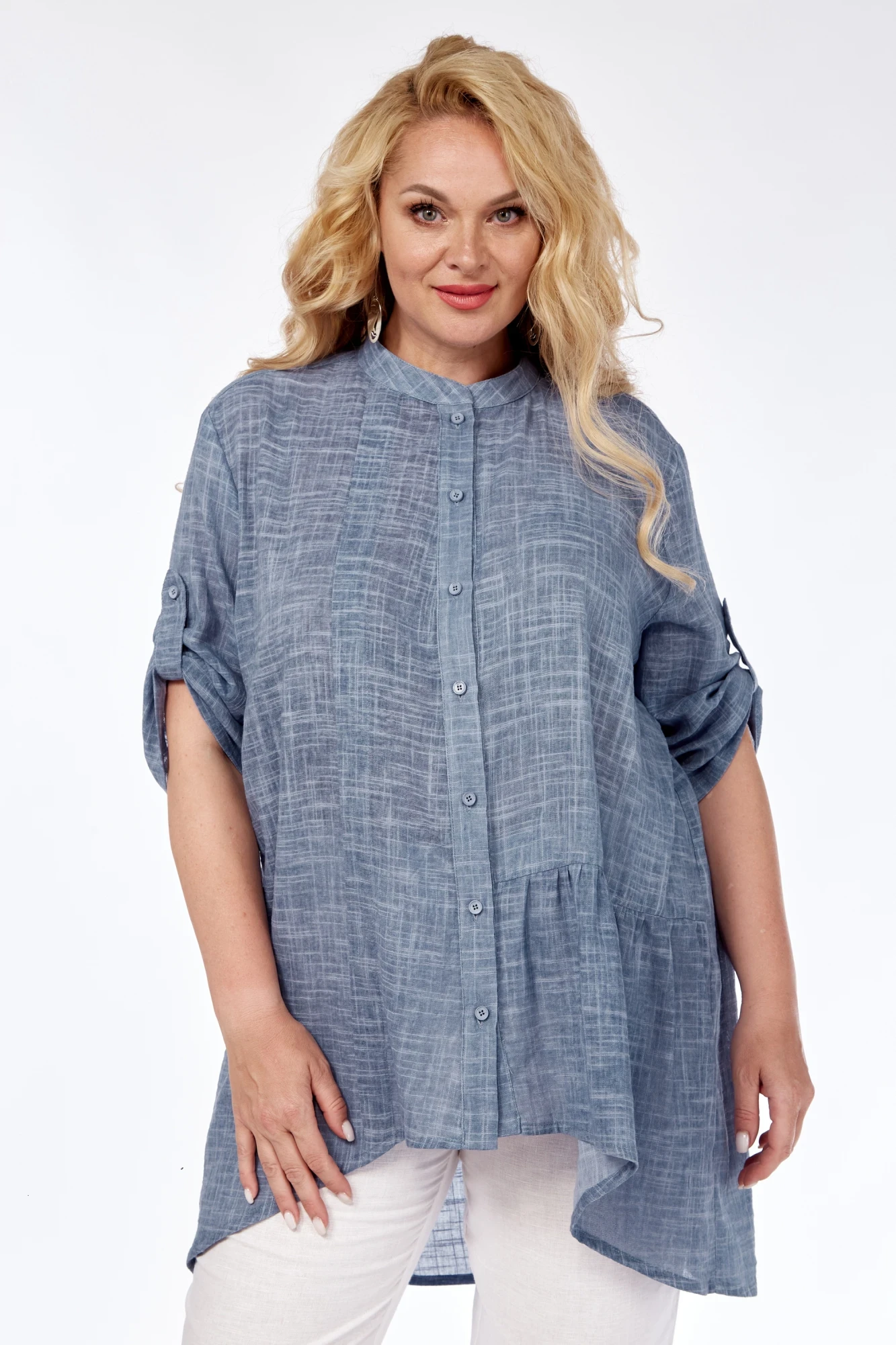 Блуза:лен 65%,вискоза 25%, эластан 10%. Брюки: лен 100%