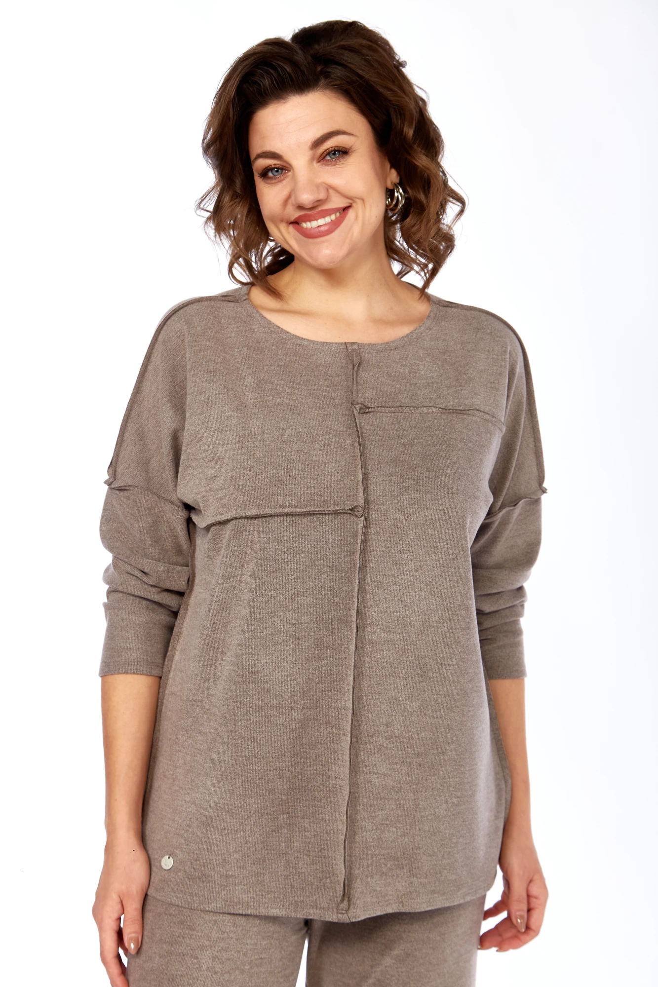Комплект брючный : джемпер и брюки из трикотажного полотна. Джемпер с разрезными на 4 части передом и спинкой,швы обработаны припусками на лицо. Горловина округллой формы обработана распошивочным швом. Низ рукава и изделия тоже обработаны распошивочным швом. Брюки прямые. Цельнокроенный пояс на резинке.