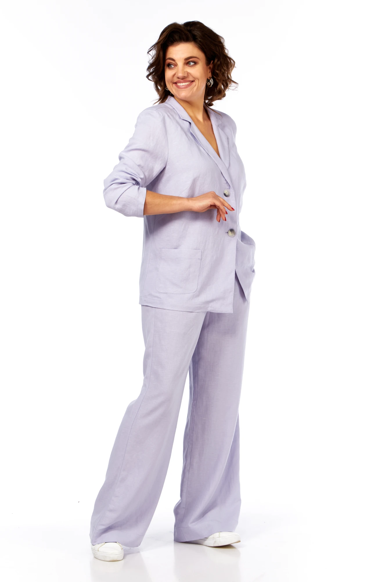 Комплект брючный состоит из жакета и брюк. Жакет полуприлегающего силуэта с центральной застежкой на петли и пуговицуы, по спинке средний шов, по переду-кокетка , нагрудные вытачки, накладные карманы. Рукав втачной, двухшовный. Воротник стояче-отложной с открытыми бортами. Брюки широкие. Верхний срез обработан поясом с резинкой, застежка на тесьму-молнию, петлю и пуговицу. На задней половинке вытачки, на передней половинке складки, в боковых швах карманы. По поясу-шлевки.