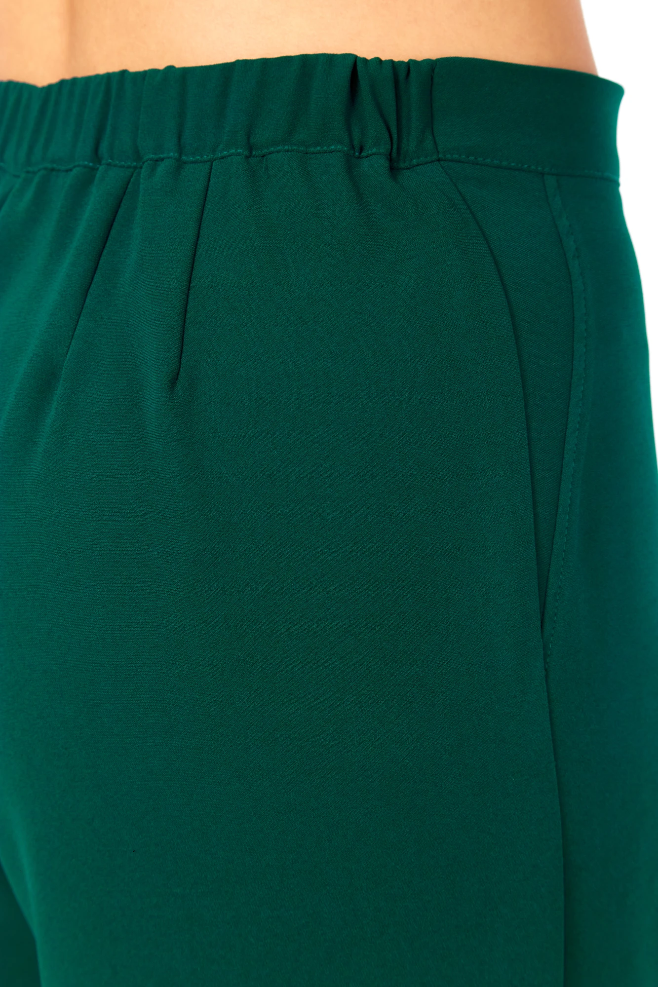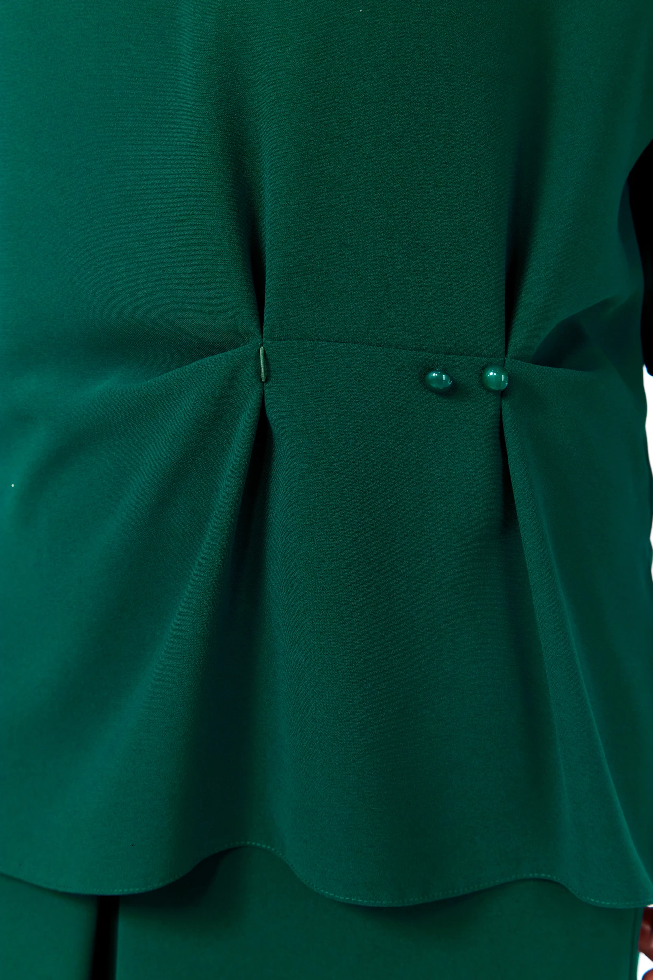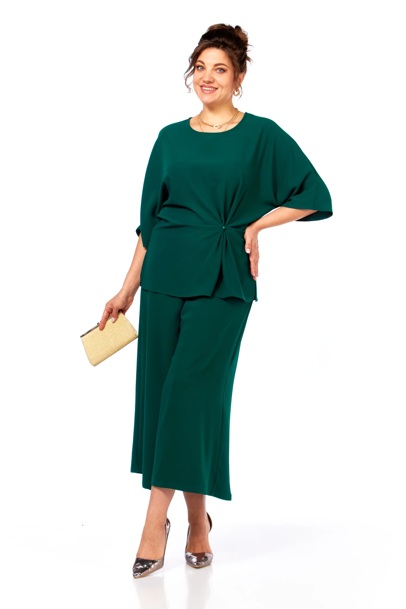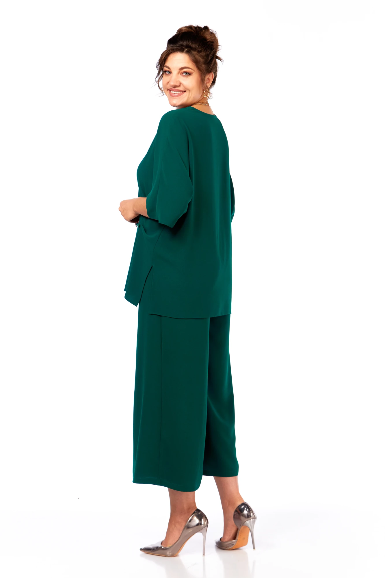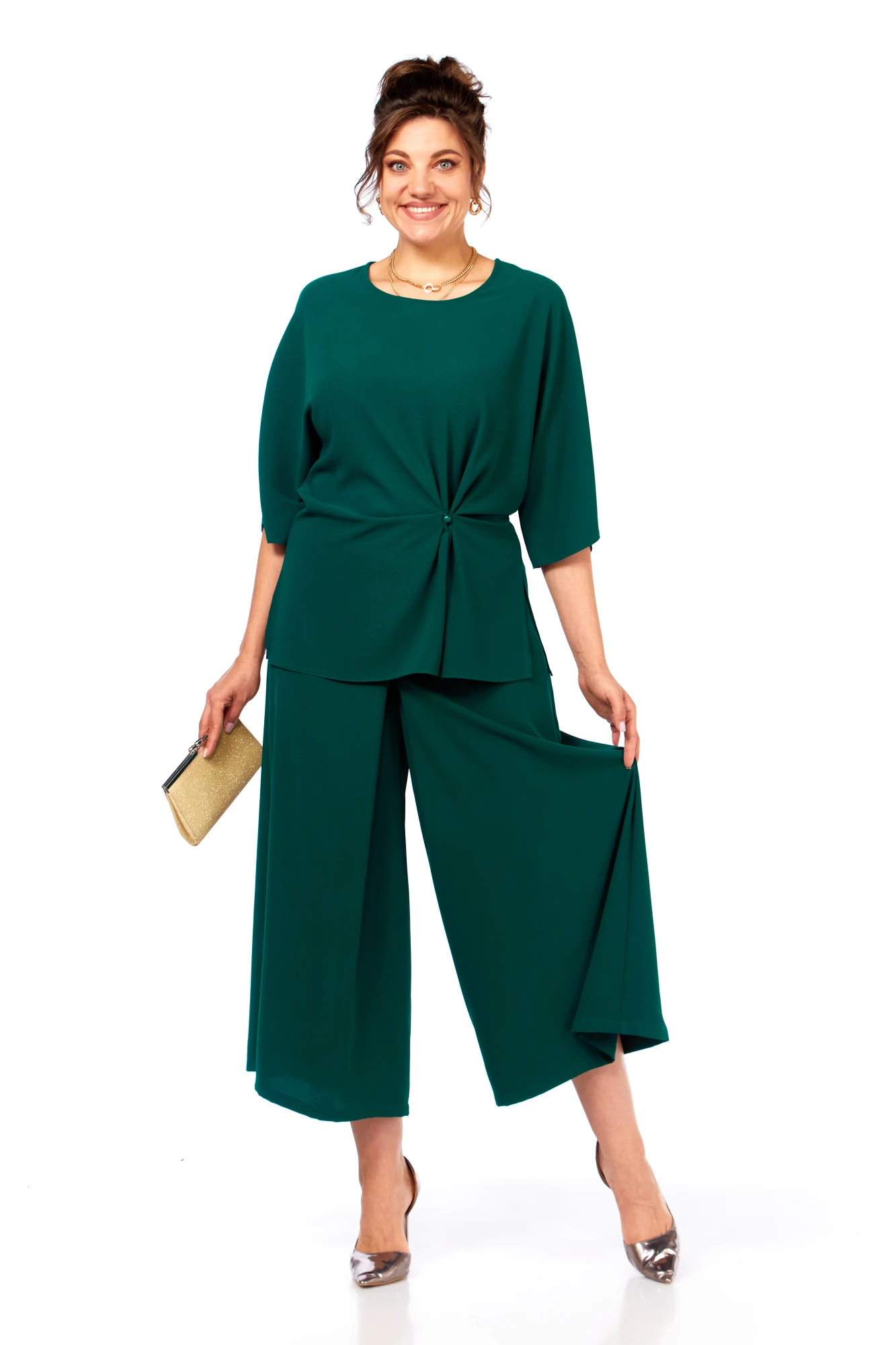 Комплект брючный состоит из блузы и кюлот. Блуза полуприлегающего силуэта с цельнокроенным рукавом. По боковым швамх разрезы, по переду застрочены вертикальные и горизонтальные складки в области талии (фиксируются навесной петлей и пуговицей). Кюлоты с центральной встречной складкой на передней половинке. Застежка-потайная тесьма-молния в боковом шве, верхний срез обработан поясом с резинкой. Имитация кармана в боковых швах.