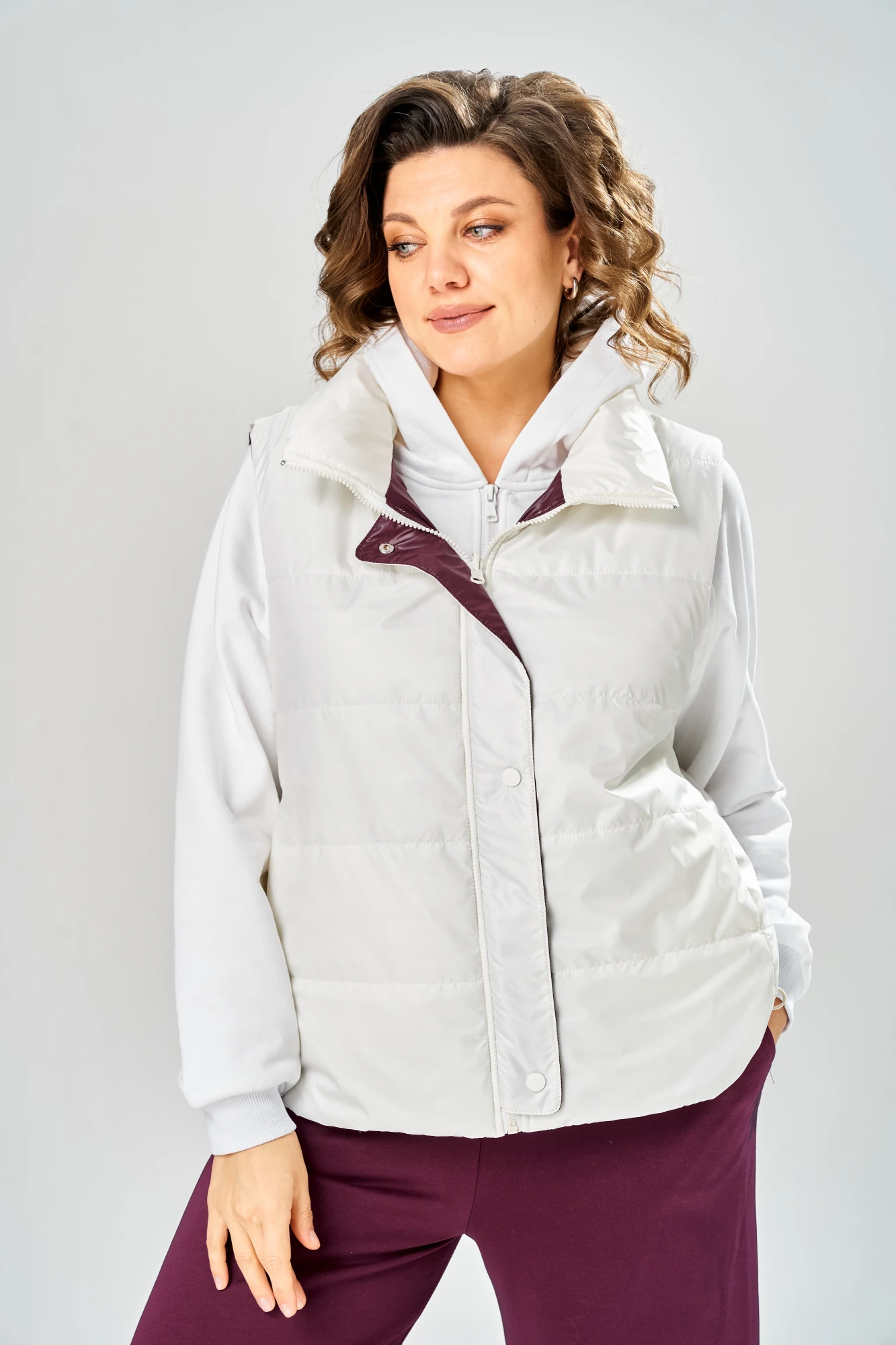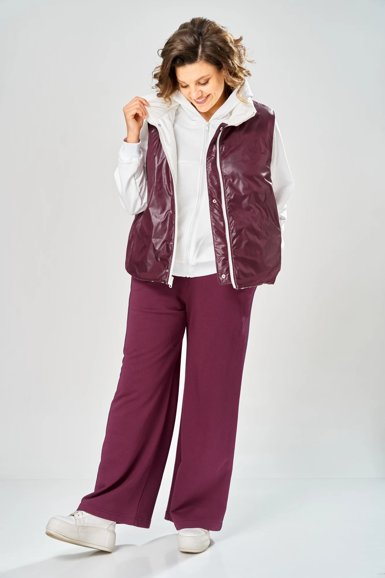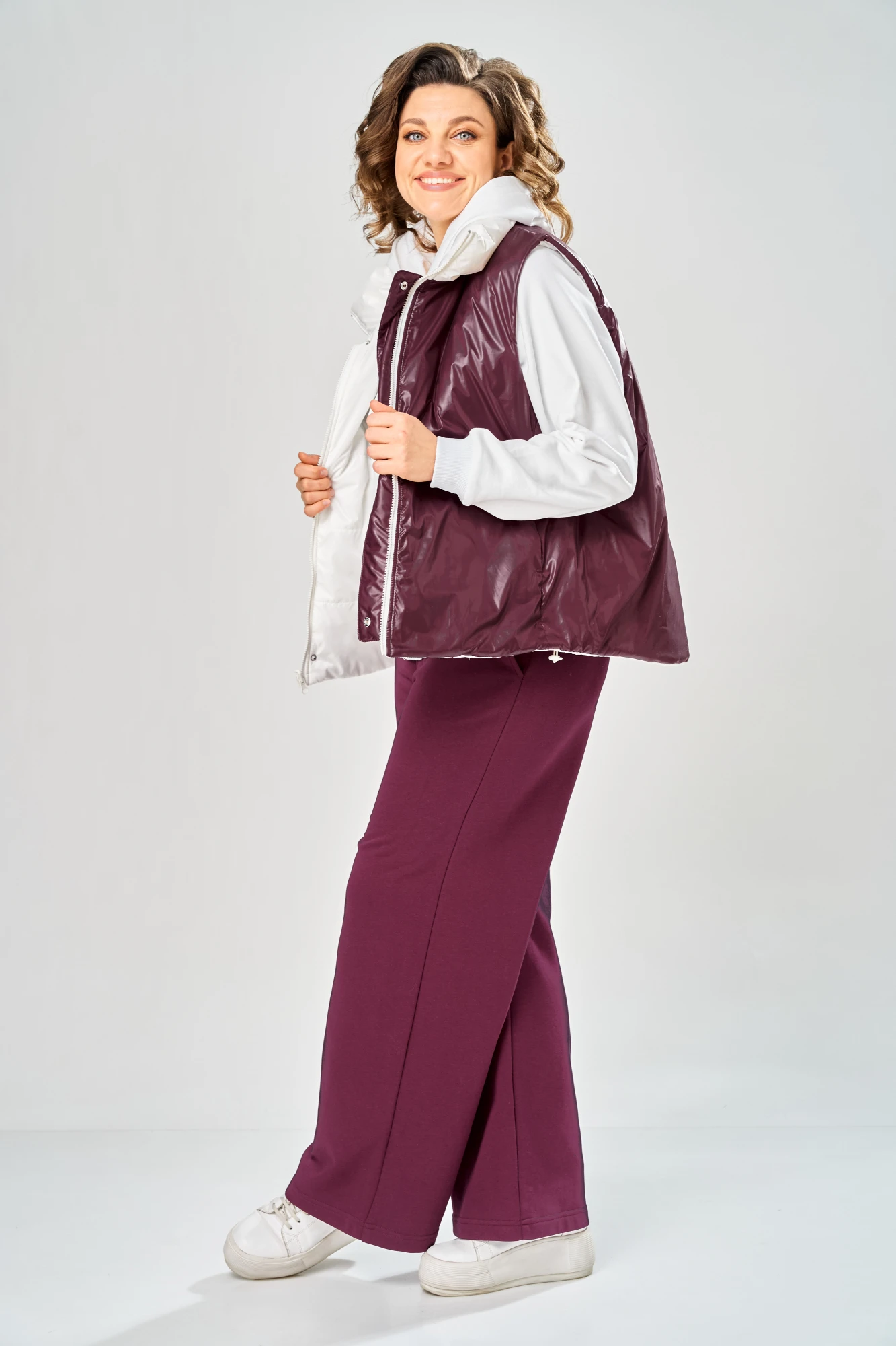 Комплект брючный.Кофта свободного кроя с центральной застежкой на тесьму-молнию. Рукав покроя реглан с притачным манжетом по низу (довяз). По переду и спинке кокетки. Капюшон со средним швом. По низу изделия отделочный пояс (довяз). В качестве отделки используется вышивка. Брюки широкие, верхний срез обработан поясом с резинкой. В боковых швах обработаны карманы.Жилетка женская прямого силуэта с центральной застежкой на тесьму-молнию и отделочную планку на кнопки. Боковой шов смещенный на перед, в шве обработаны карманы. Воротник-стойка со складками по линии горловины. Жилетка двухсторонняя. Температурный режим до +5 градусов.