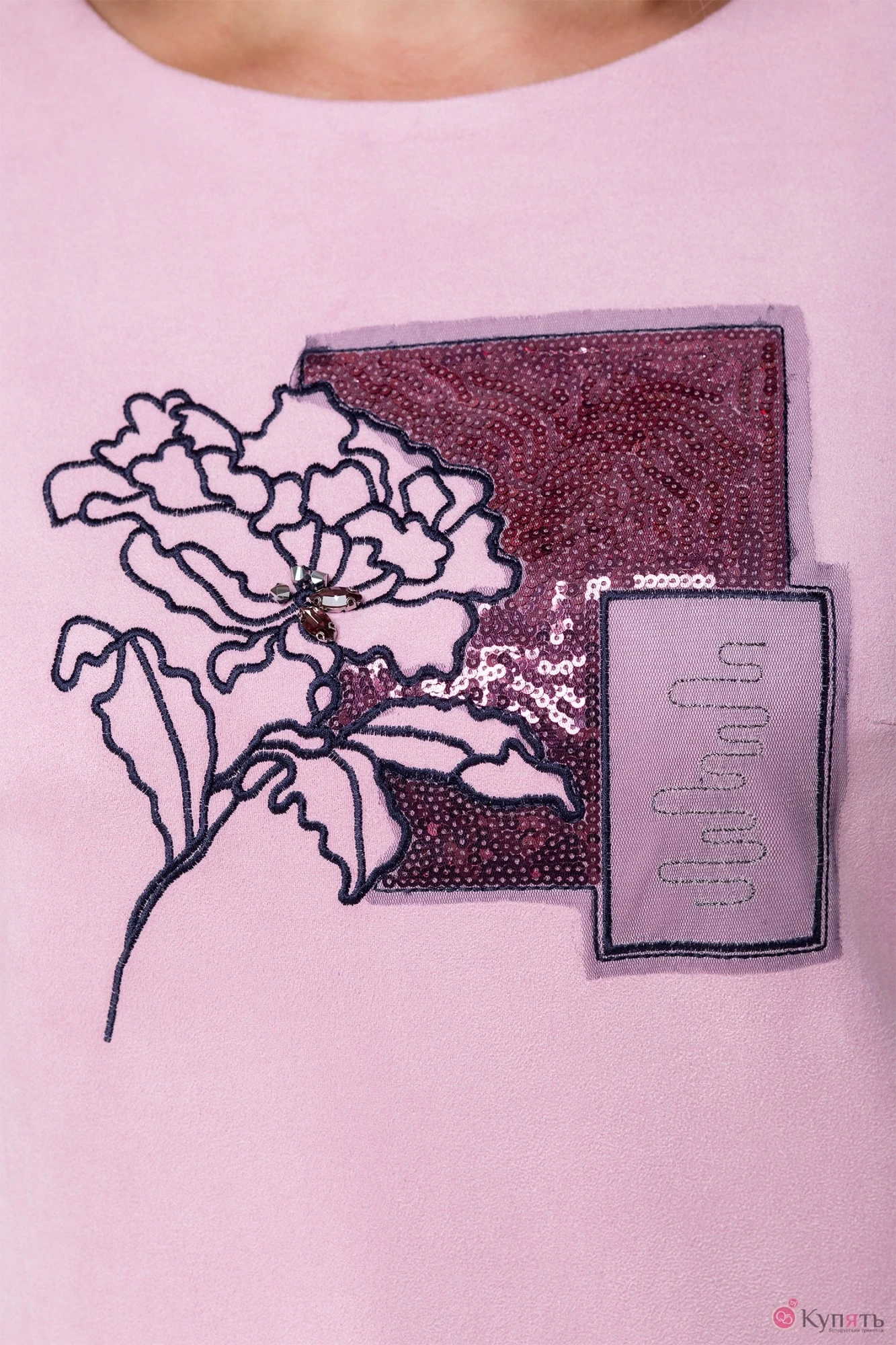 Комплект женский, состоит из блузки и брюк. Блузка полуприлегающего силуэта, выполнена трикотажного полотна ""замша""со спущенным плечевым срезом. По спинке блузки разъемная тесьма-молния. Перед блузки декорирован вышивкой с пайетками. Брюки прямые, слегка зауженные к низу. В боковых швах брюк функциональные карманы. Костюм прекрасно подойдет для повседневной носки, вы будете выглядеть в нем неотразимо и роскошно.