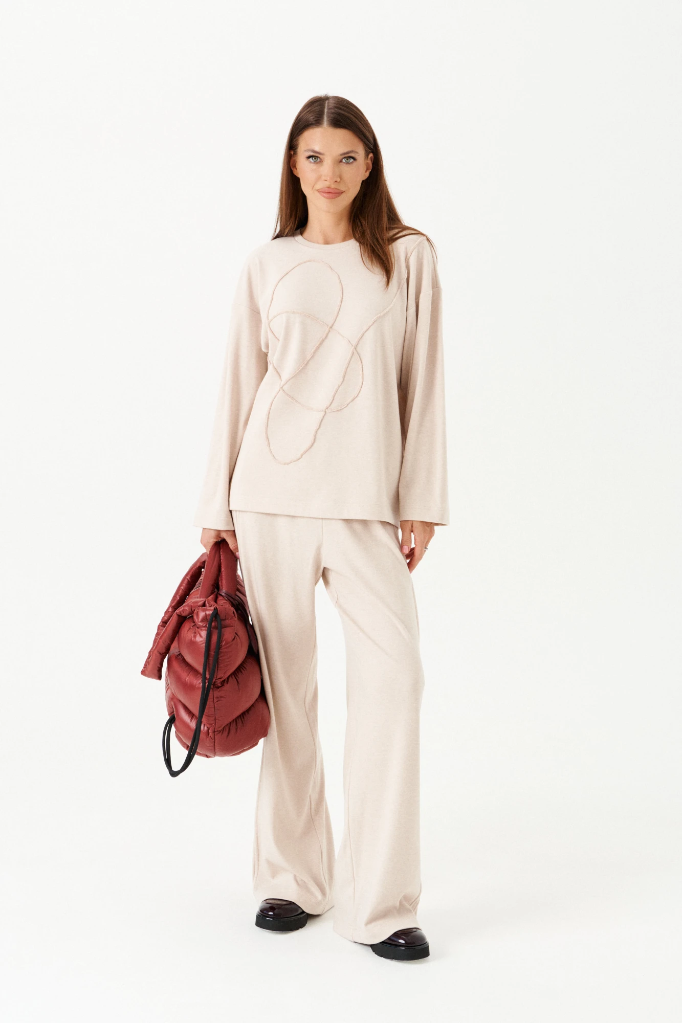 Комплект женский 2-х предметный из трикотажного полотна, состоящий из джемпера и брюк. Джемпер прямой, свободный, со спущенной линией плеча, с вышивкой по переду. Вырез горловины округлой формы. Перед и спинка цельные. Рукав втачной, длинный. Брюки прямые, свободные, одношовные, с защипами по бокам. Пояс цельнокроеный, на резинке.