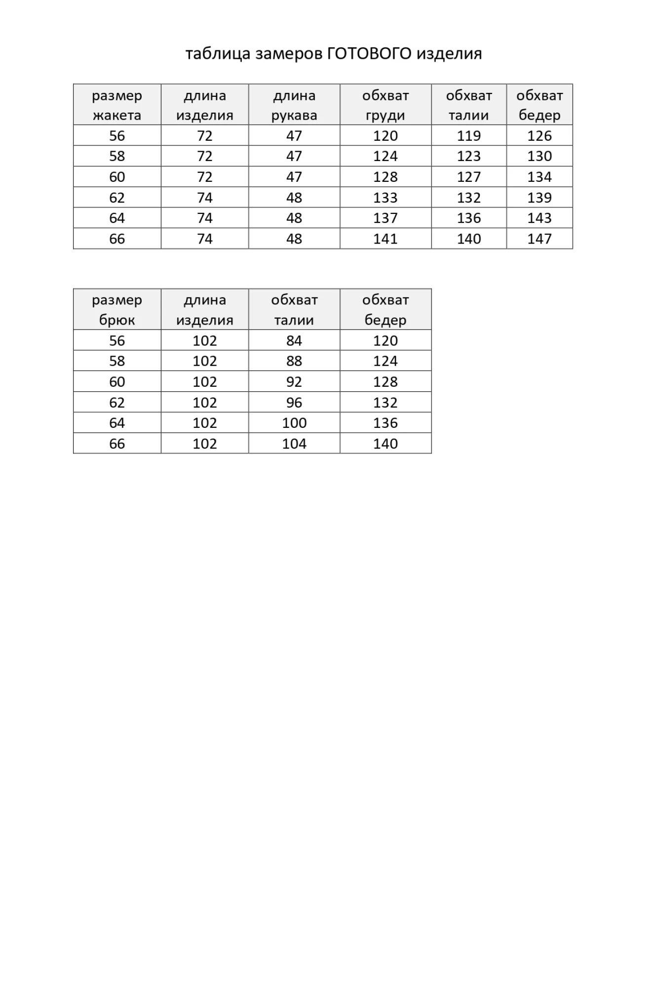 Таблица размеров