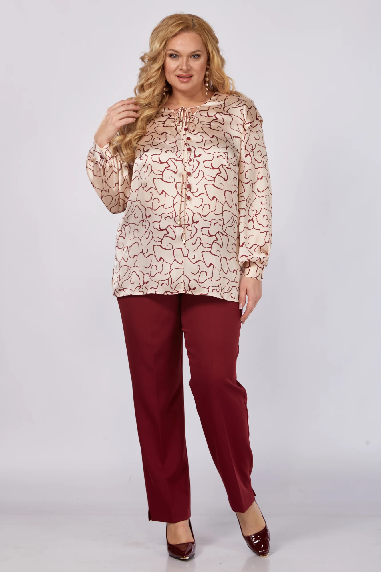 Брючный костюм Элль-стиль 2375а бордовый., блуза пудра, принт двойка