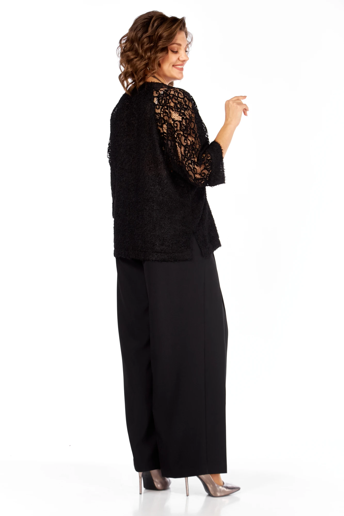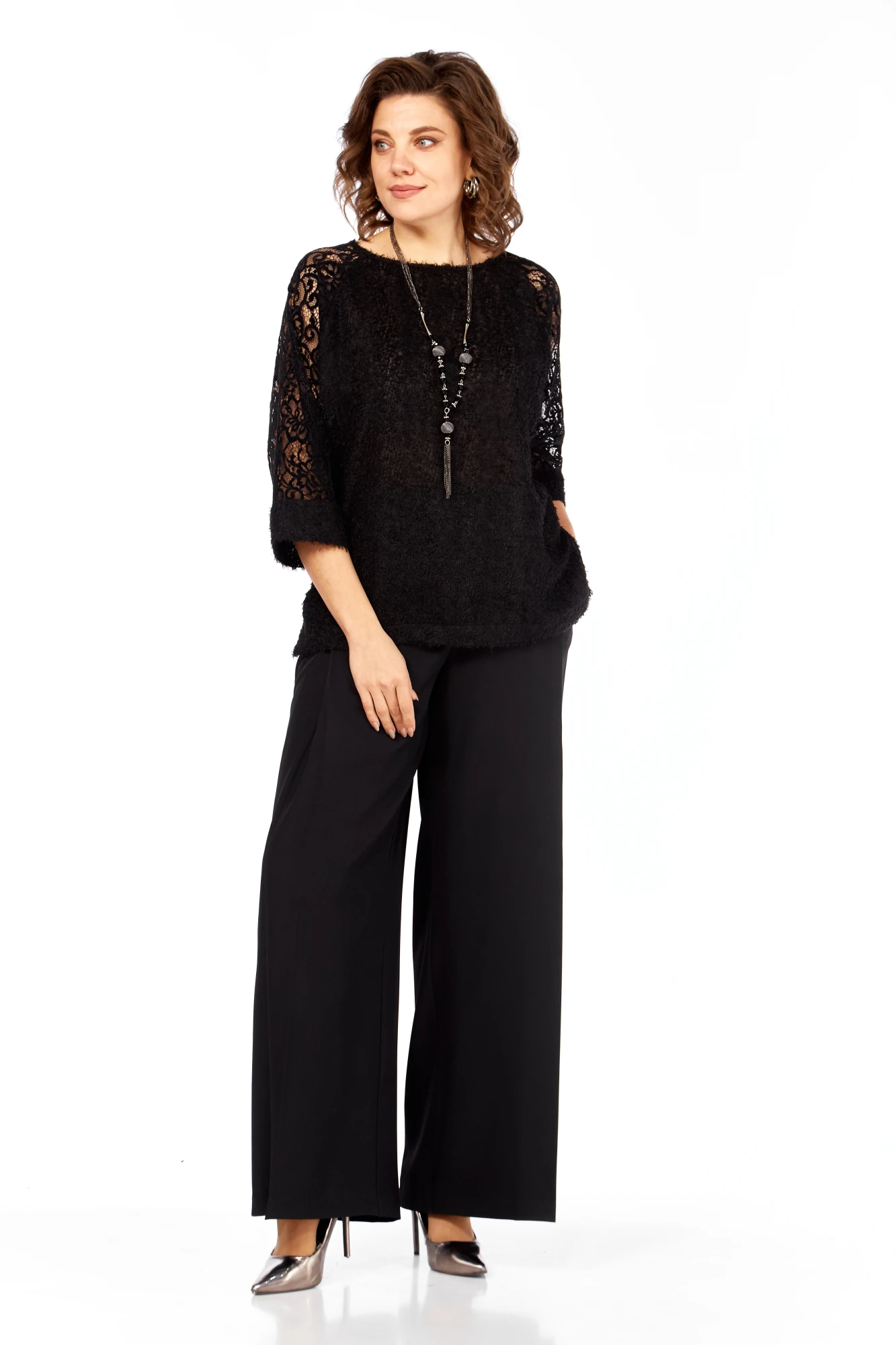 Комплект женский брючный 2-х предметный. Праздничная элегантная блузка полуприлегающего силуэта, выглядит эффектно, прекрасно подойдет для вечерних мероприятий. Горловина аккуратной округлой формы. Рукав выполнен из мягкого кружева, что придает дополнительный шарм, длина 7/8. В боковых швах предусмотрены разрезы. Невероятно комфортные, элегантные брюки-палаццо, образ в котором будет привлекать к себе внимание окружающих. Идеально подходит как для офиса, так и для вечернего выхода. Брюки свободные. По переду заложены складки, в боковых швах расположены боковые карманы, застежка-молния. Пояс притачной, сзади на резинке, это обеспечивает комфортную посадку. Широкий крой палаццо добавляет образу легкость и непринужденность, стрелки визуально удлиняют силуэт
