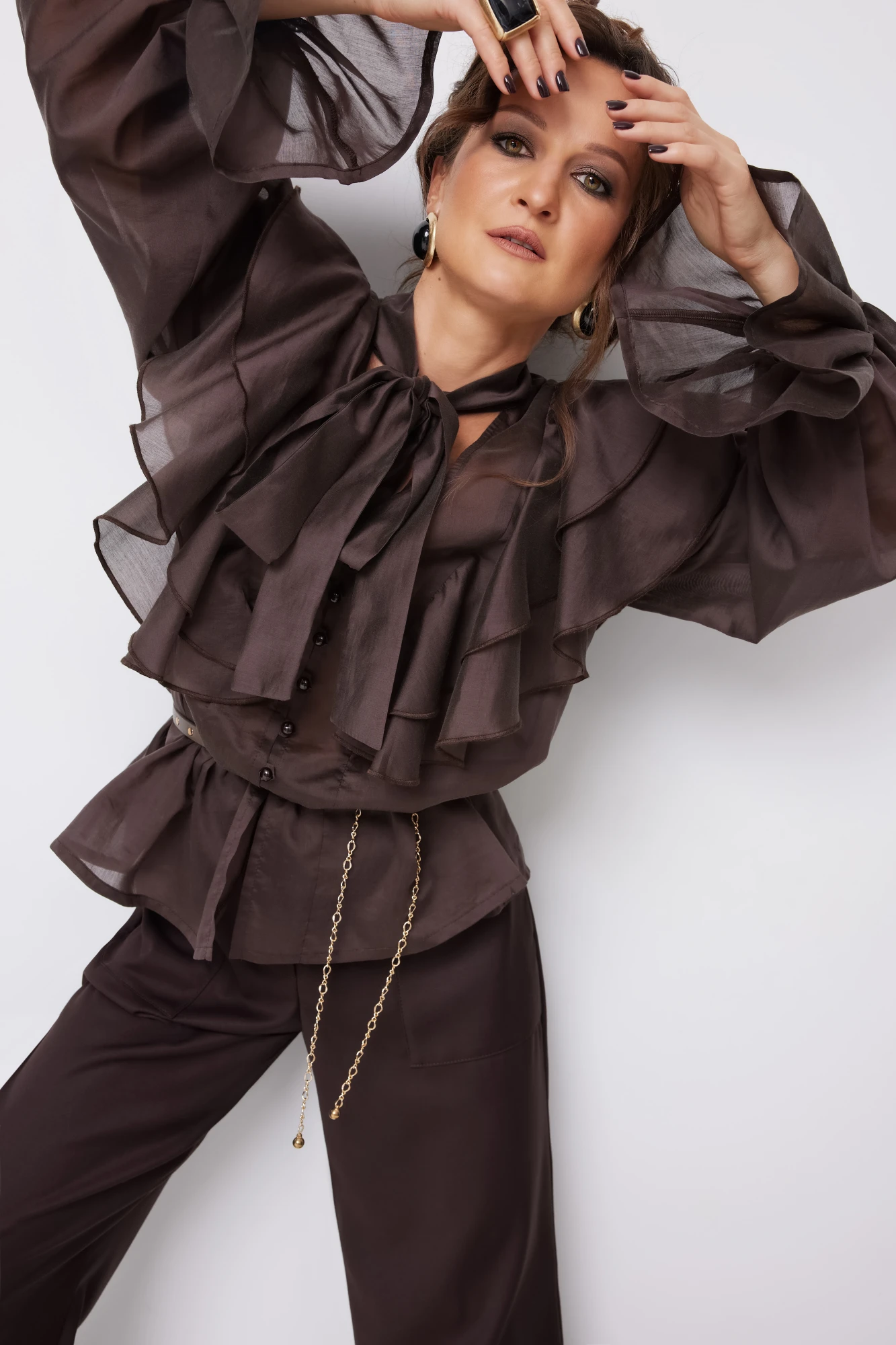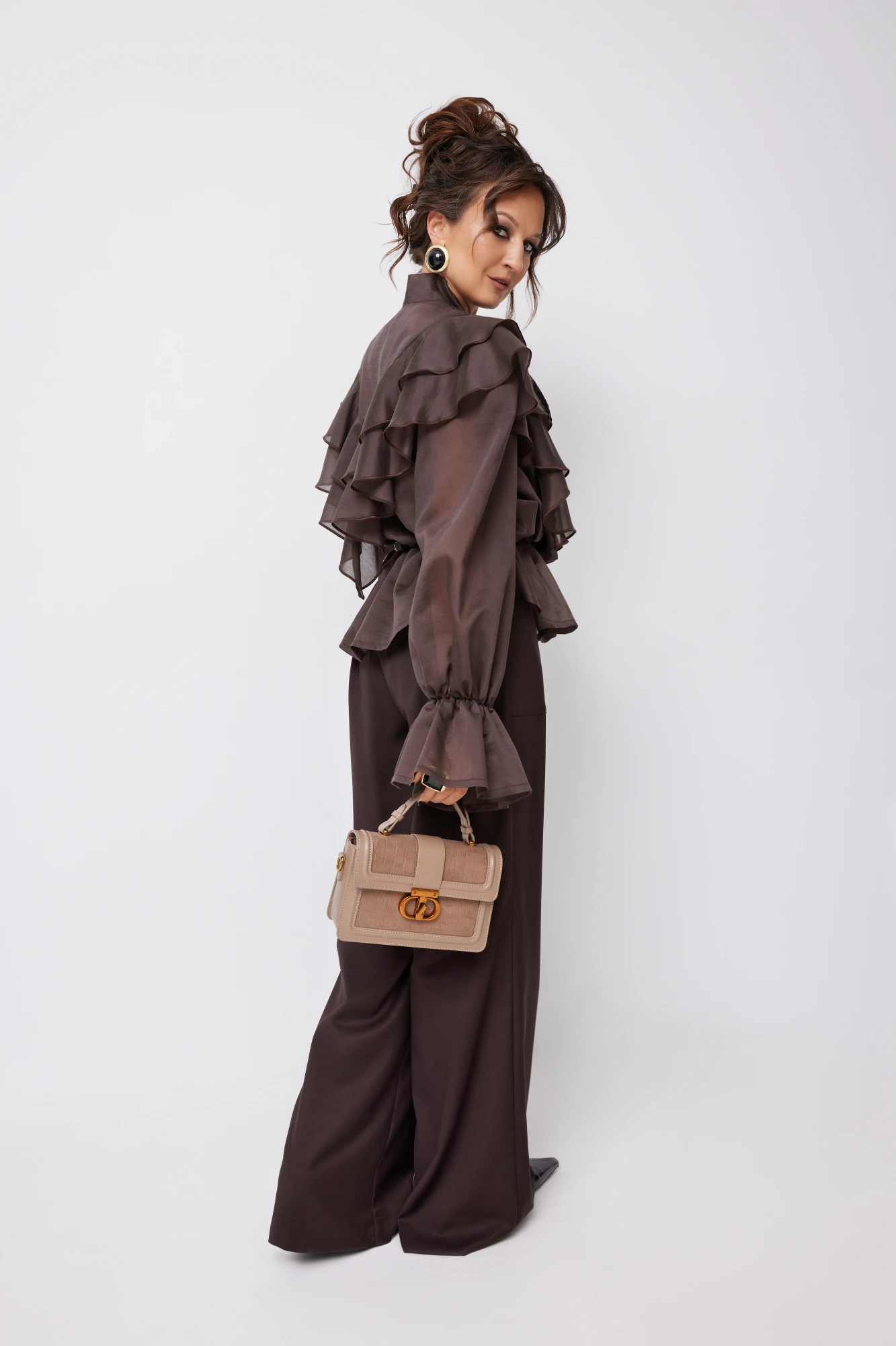 Размер 46 : Блузка ОГ-110, ОТ-126, ОБ-154, длина изделия спинки-64, ширина изделия спинки-36, ширина плеча-9, длина рукава втачного-69, ширина рукава на уровне резинки-11; Брюки : ОТ в собр.-74, ОТ в раст-84, ОБ-106, ширина изделия по низу-37 , длина изделия по боковому шву с поясом-110.