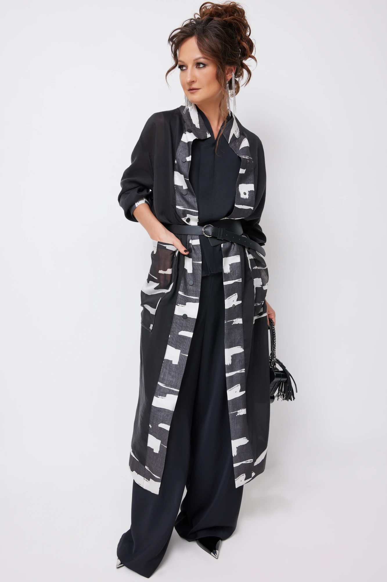 Размер 46 : Накидка: ОГ-108, ОТ-112, ОБ-118,ширина плеча-14,5, длина рукава втачного-60,ширина рукава на уровне ОП-20,5, ширина рукава на уровне низа-11, длина изделия спинки без стойки-122, ТОП: ОГ-100, ОТ-110, ОБ-124, длина изделия спинки по центру-73, ширина изделия спинки-36. Брюки: ОТ в собр.-70, ОТ в раст.-94, ОБ-108, длина изделия по боковому шву с поясом-113