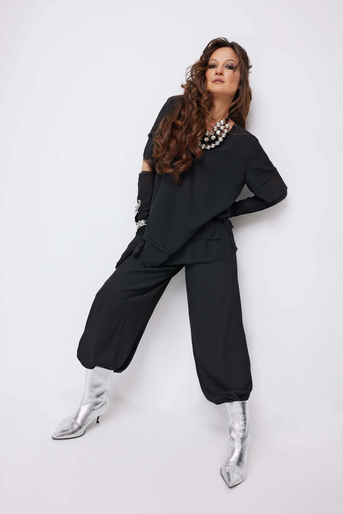 Комплект женский, состоящий из блузы, брюк и жакета. Блуза прямого силуэта с круглым вырезом, рукав втачной одношовный короткий. Перед спинки и рукав двойные с разноуровневым низом и открытым срезом. Жакет полуприлегающего силуэта, воротник стойка с центральной бортовой застежкой и навесной петлей и пуговицей, рукав втачной двушовный длинный, заканчивающийся притачной манжетой и декоративным элементом ввиде манжеты из отделочной ткани. Перед с вертикальными рельефами и карманами "в рамку" с клапаном. Спинка со средним швом и высоким вырезом. В жакете применяются швы с открытым срезом. В комплекте нарядная съемная брошь. Брюки прямого силуэта на притачном поясе с резинкой по задней части и бокам. Перед с имитацией гульфика и боковыми карманами
