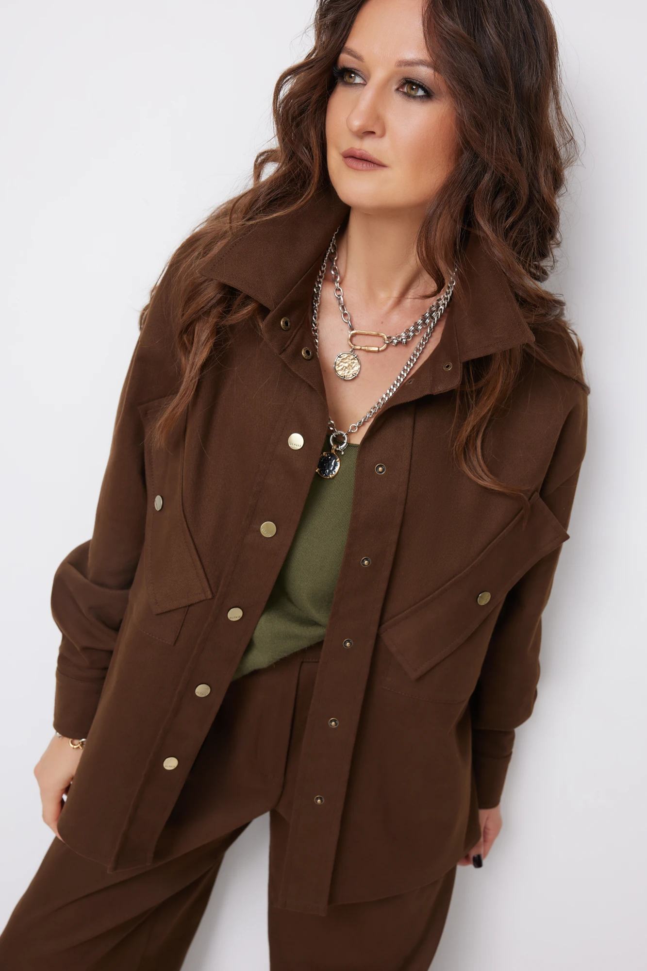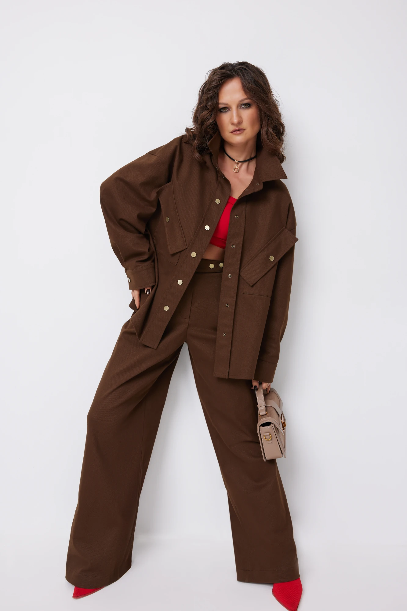 Комплект женский, состоящий из рубашки и брюк. Рубашка прямого силуэта, со спущенной линией плеча. Рукав одношовный втачной длинный с разрезом, складками и притачной манжетой, застегивающийся на кнопку, воротник сорочечного типа.  Спинка с горизонтальной кокеткой и встречной складкой на нижней части. Перед с центральной застежкой ввиде планки на кнопки. По переду накладные фигурные карманы с клапанами.  Брюки прямого силуэты с притачным поясом на застежке молнии. По спинке по поясу резинка и талиевые вытачки. Перед с застежкой-гульфик и кнопкой, с боковыми карманами и складками на уровне талии.