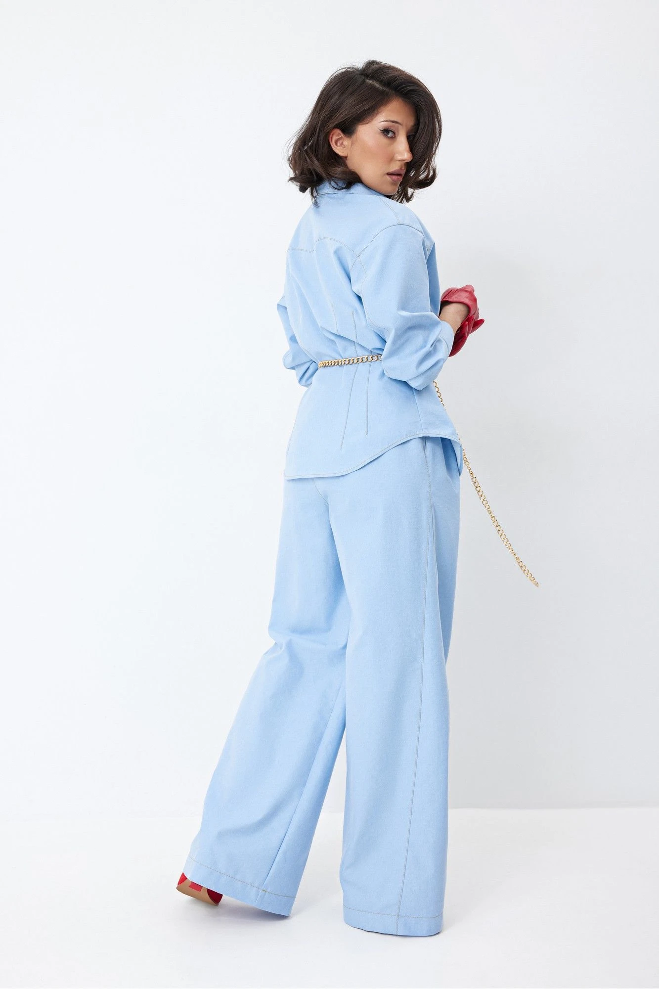 Размер 44: Блуза: ОГ-104, ОТ-80, ОБ-108, ширина плеча-18, длина рукава втачного-59, ширина рукава на уровне ОП-21, длина изделия спинки по центру-62. Брюки: ОТ в собр.-70, ОТ в раст.-84, ОБ-102, ширина изделия по низу-31,5, длина изделия по боковому шву с поясом-111