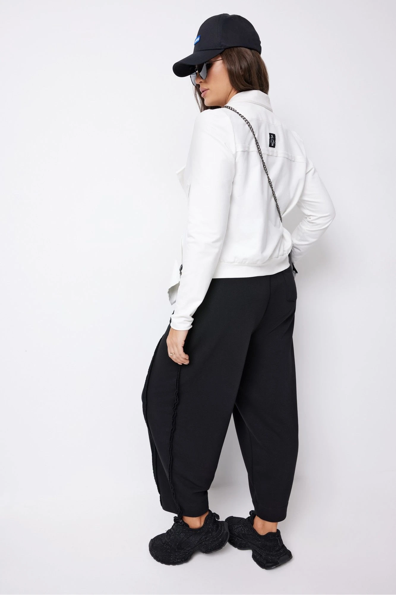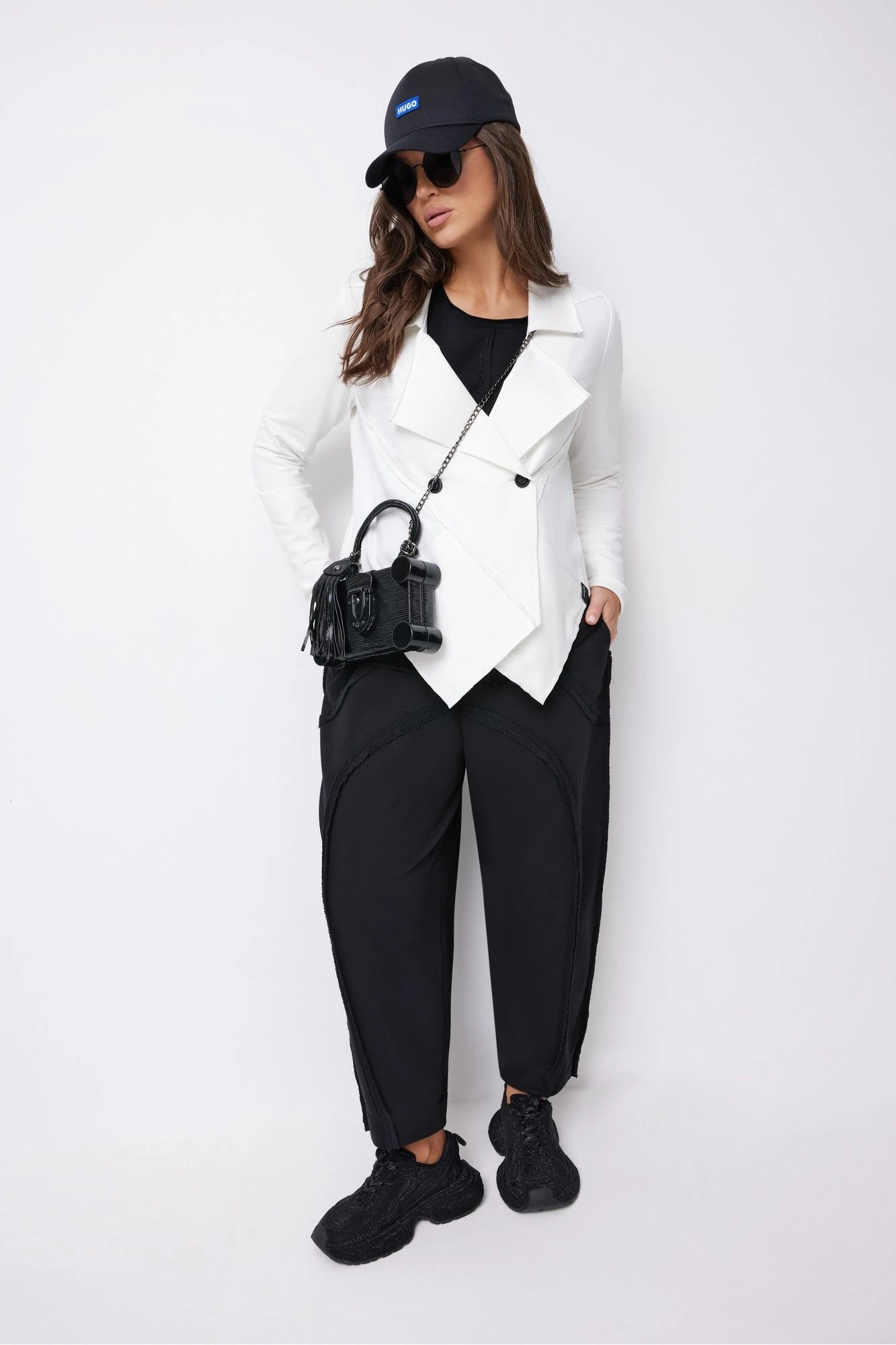 Размер 46: Жакет: ОГ-114, ОТ-112, ОБ-108, ширина плеча-12, длина рукава втачного-67, ширина рукава на уровне ОП-19, длина изделия спинки по центру-53. Топ: ОГ-112, ОТ-100, ОБ-105, ширина плеча-11. Брюки: ОТ в собр.-64, ОТ в раст.-102, ОБ-112, ширина изделия по низу-14, длина изделия по боковому шву с поясом-97.