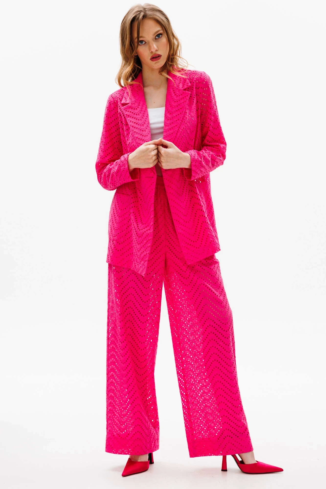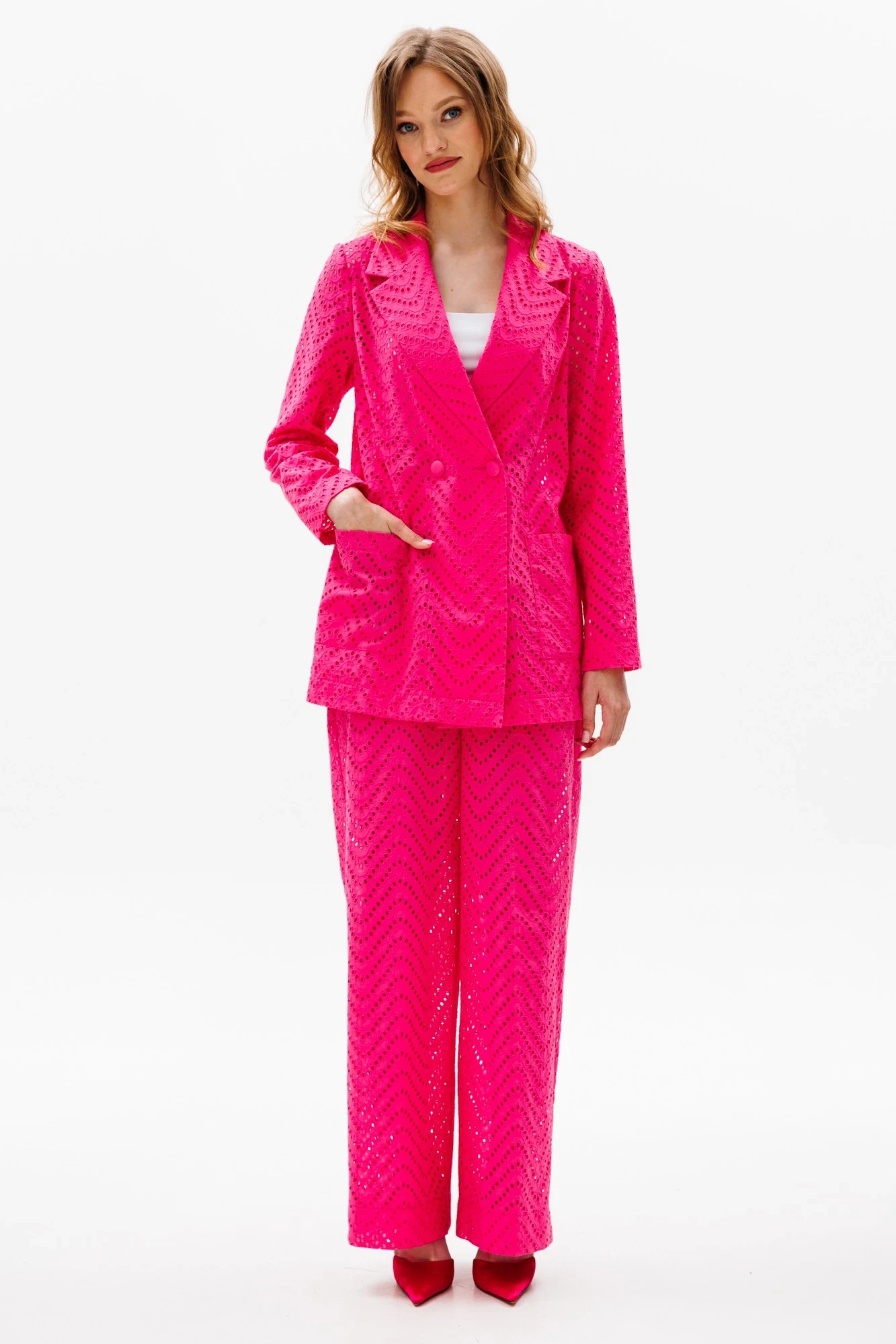 Комплект: жакет +брюки. Комплект выполнен из хлопка с вышивкой. Жакет прямого силуэта до линии бедер. Спереди накладные карманы. Центральная двубортная застежка на пуговицы. Горловина пиджачного типа. Рукав втачной двухшовный. Брюки прямого силуэта на притачном поясе с эластичной тесьмой. В боковых швах карманы с наклонным входом. Брюки на отлетной подкладке в виде шорт. Топ не входит в комплект.