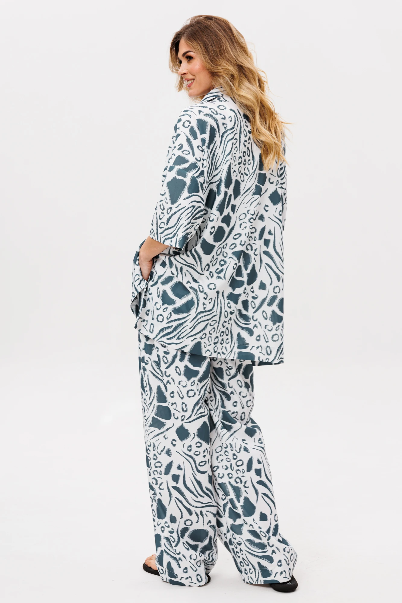 Брючный костюм EOLA 2858 молочный с синим принтом