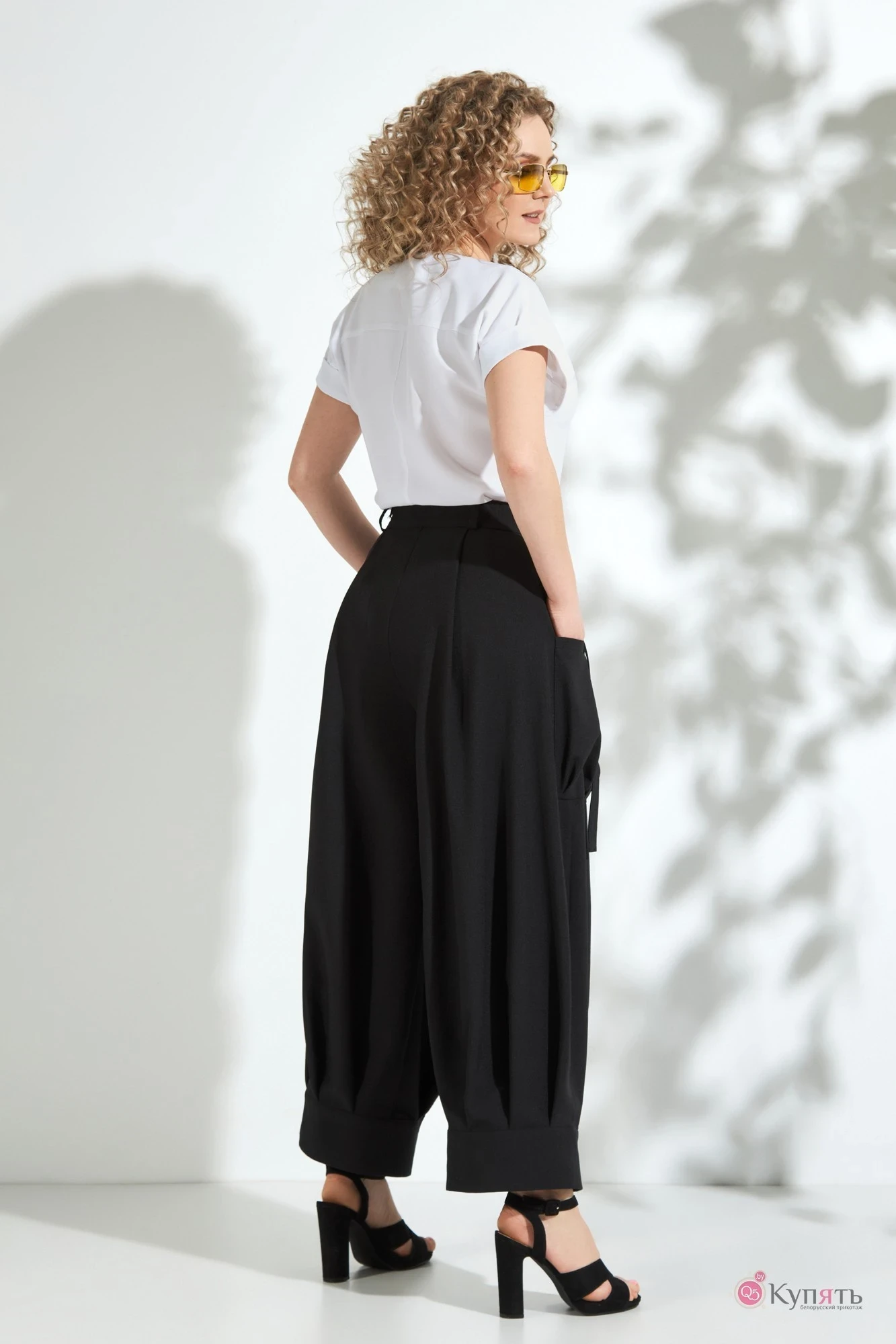 Комплект женский состоящий из блузона и брюк. Блузон прямого кроя с отрезной кокеткой по переду. Рукав приспущенный с манжетой по низу. Брюки высокой посадки с заложенными складками по линии талии и по низу. Изделие на широкой манжете по низу. По брючинам расположены накладные карманы.