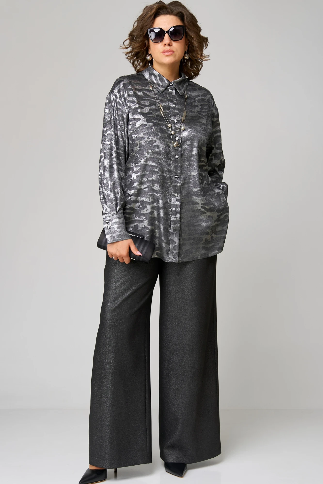 Костюм женский нарядный состоящий из блузы и брюк. Блуза женская нарядная выполнена из блузочной ткани с анималистическим принтом. Вырез горловины воротник на стойке рубашечного типа, застежка доверху на петли и пуговицы, плечо спущенное, рукав втачной по низу со складками на притачной манжете. По спинке двойная кокетка, в боковых швах обработаны разрезы, низ фигурный. Декором блузы служит дизайн самой ткани, декоративные пуговицы со стразами. Брюки прямые на притачном поясе выполнены из брючной ткани с люрексом. Пояс по всей длине на резинке, в боковх швах обработаны разманы. Декором служит дизайн ткани.