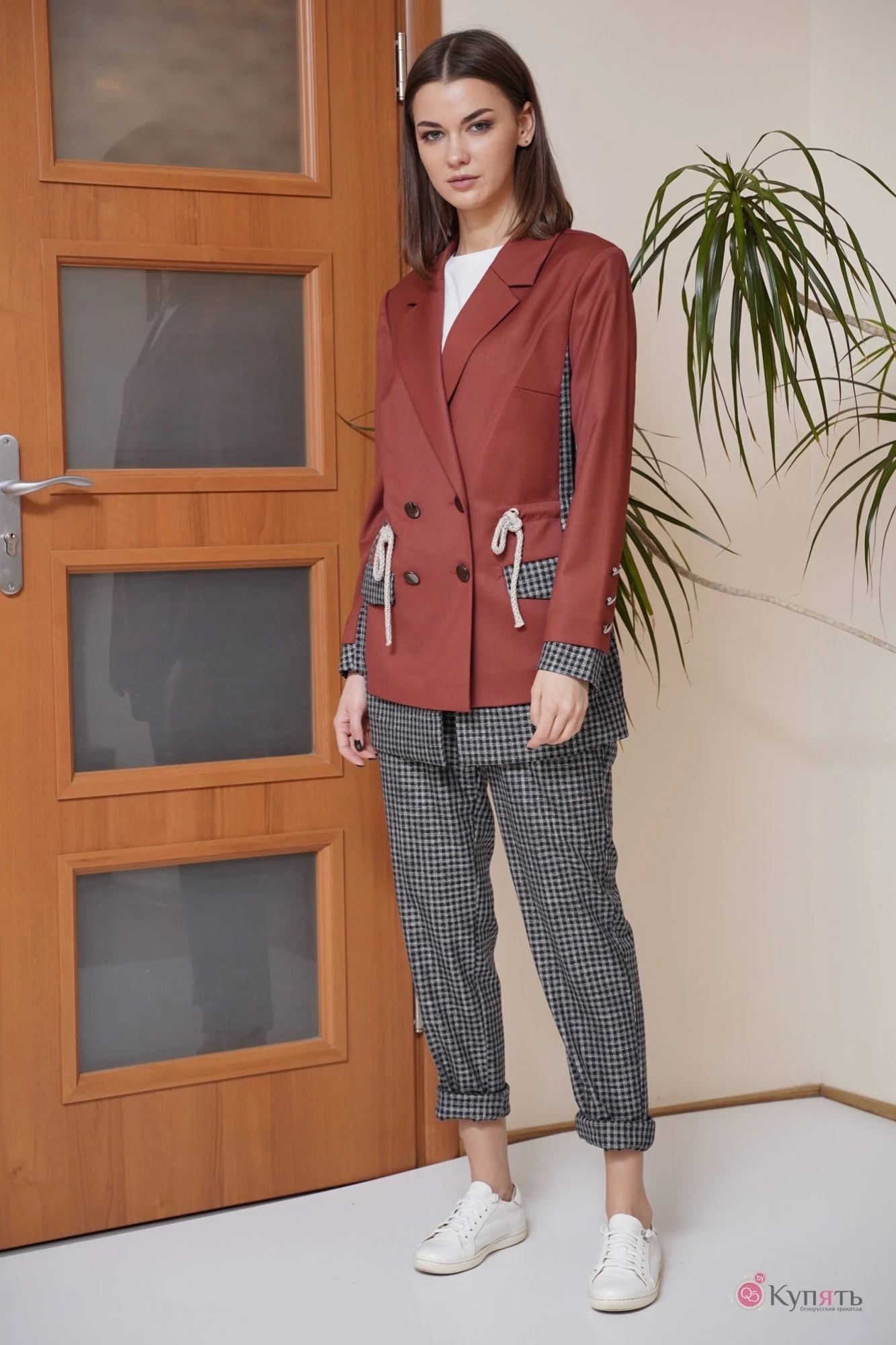 Сегодня, каждый фасон брючного женского костюма заслуживает внимания, ведь такая одежда - это всегда эффектно и эксклюзивно для любой модницы. Особенно популярны в этом сезоне костюмы с укороченными брюками в спортивном стиле, которые позволяют почувствовать себя свободно и комфортно, но при такой свободе выглядеть очень стильно. Жакет комбинированный из двух тканей. Двубортный с низкой застежкой. Покрой-втачной, силуэт - полуприлегающий. Полочка комбинированная с отрезным бочком, бочок и нижняя часть полочки из ткани в клетку, центральная часть полочки из однотонной ткани с нагрудной вытачкой и прорезным карманом с клапаном. Спинка с отрезными кокетками и кулисой. Рукав комбинированный с необычной отлетной шлицей и пуговицами. Брюки из ткани в клетку, свободного покроя с боковыми карманами. Пояс брюк на эластичной тесьме, центральная часть пояса с люверсами и декоративными шнурами-завязками. Длина жакета около 72 см. Длина рукава около 60 см. Длина брюк около 101 см.