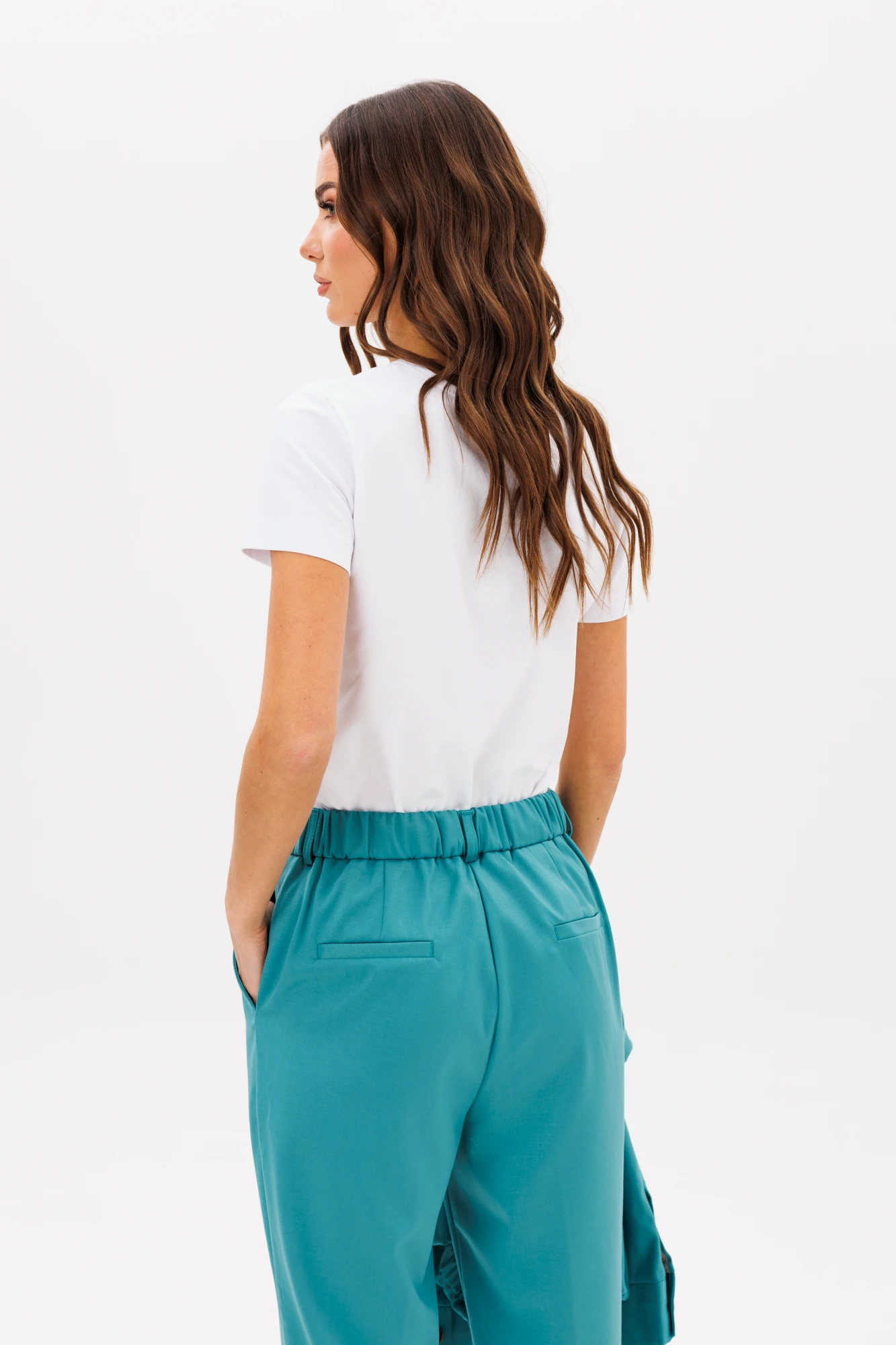Брюки классические, с наклонными боковыми карманами, притачным поясом, эластичным в области спинки, застёжкой на брючный крючок и молнию.