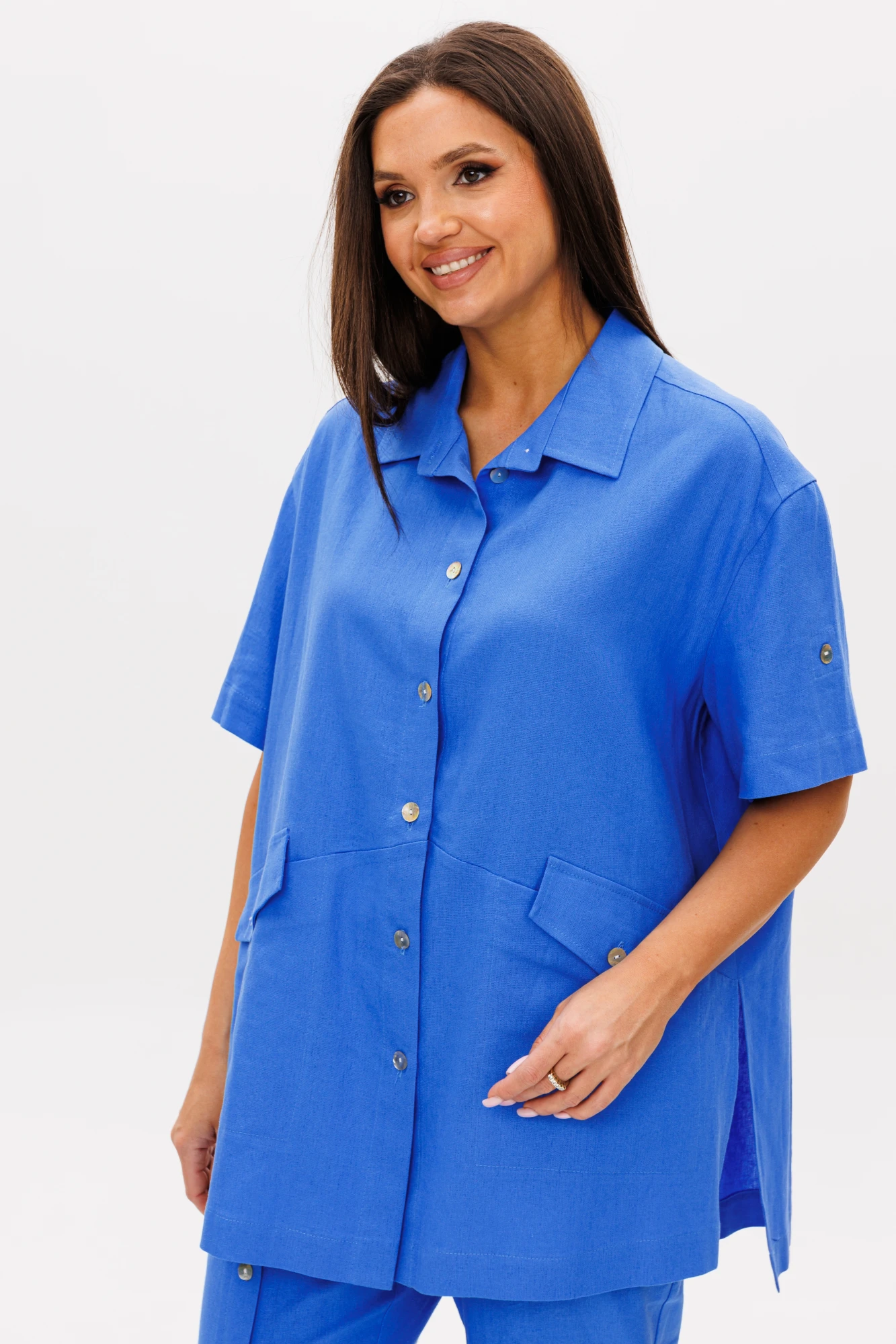 Брючный комплект всегда смотрится эффектно и дорого. Свободная, упрямлённая рубашка и брюки в расслабленном стиле. Покрой - рубашечный, воротник классический рубашечный, застёжка центральная. Полочка с диагональным членением и карманом с клапаном. Спинка с отрезной кокеткой и мягкими складками. В боковых швах - разрезы. Рукав с отделочной пуговицей.