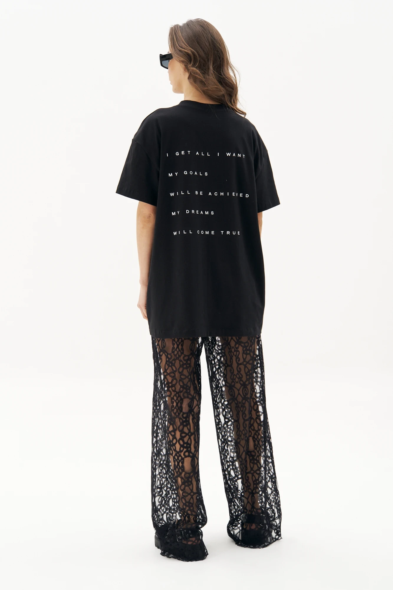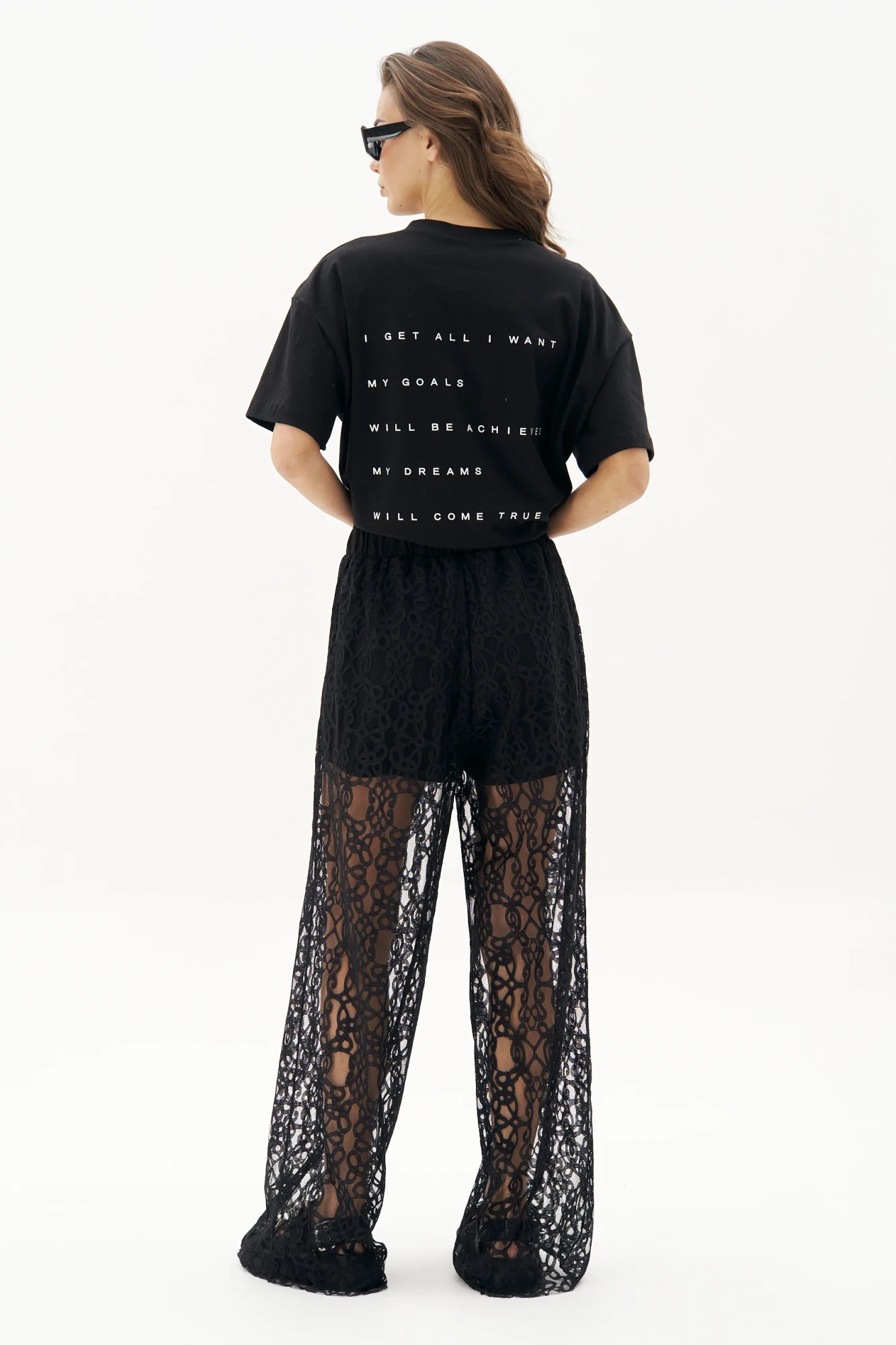Свободная футболка и гипюровые брюки с эластичными шортами внутри.