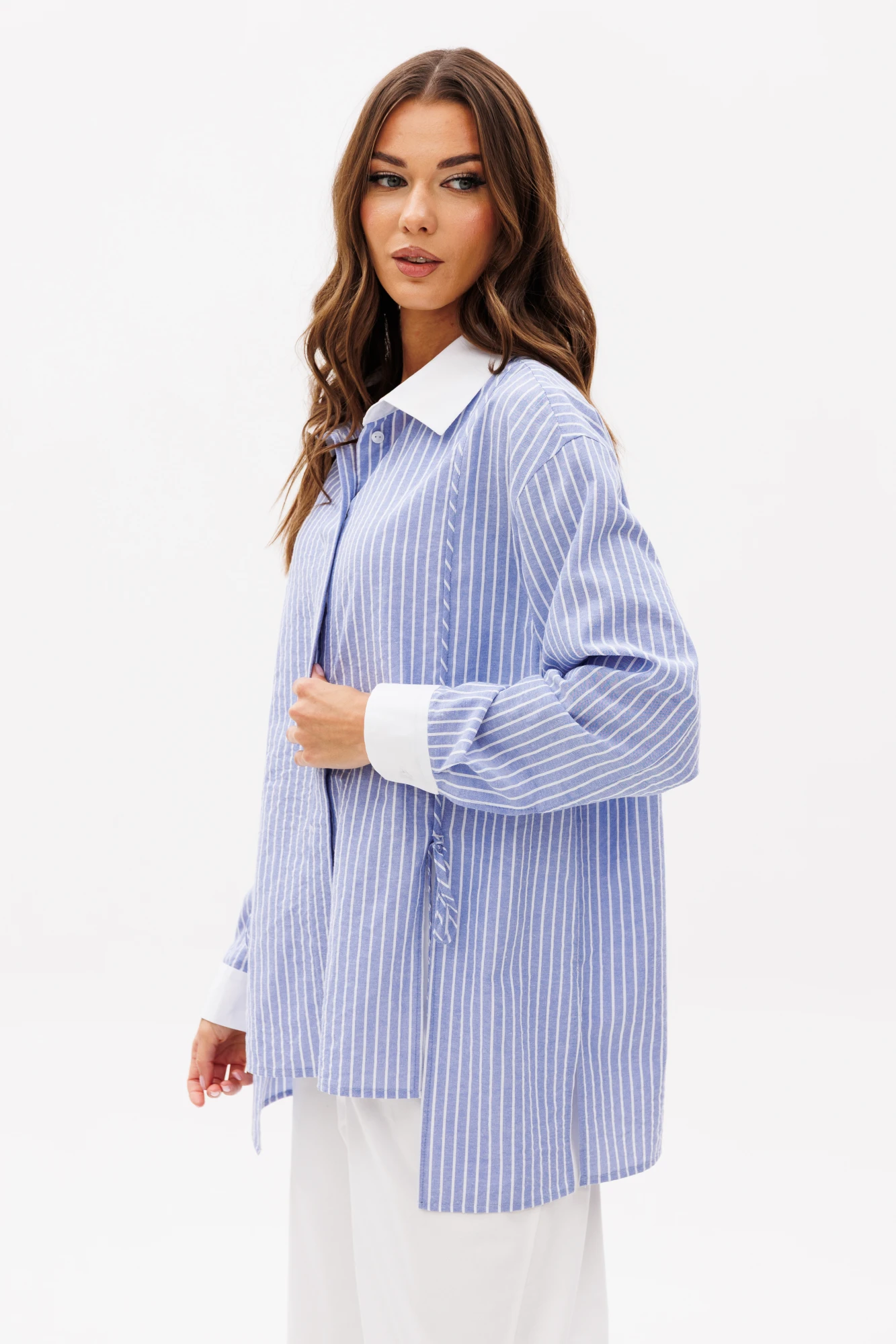 Свободный расширенный силуэт, рубашечный покрой, потайная застежка на петли и пуговицы, рубашечный рукав и воротник. Полочка с вертикальными рельефами, разрезом и отделкой под углом 45 градусов. Спинка с центральным швом с отделкой из тесьмы под углом 45 градусов.