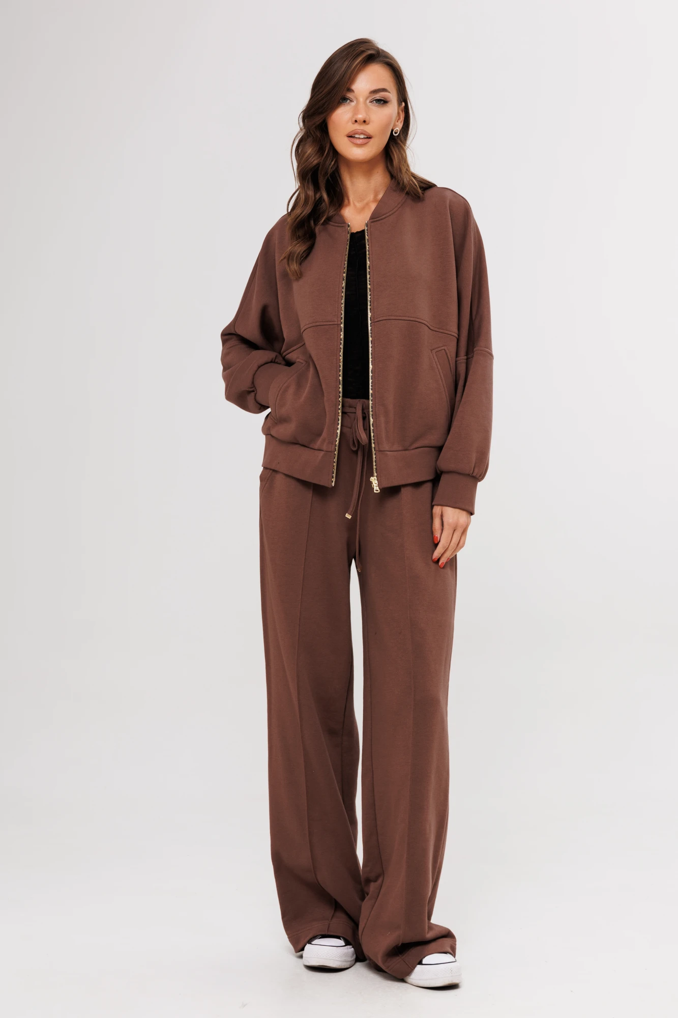 Спортивный костюм сегодня - это не только одежда для спорта гардероба любой современной девушки - он является ещё и элементом стиля.Спортивный костюм в шоколадном цвете будет уместен везде и всегда, несмотря на любые веяния моды.Костюм состоит из свободной лёгкой куртки и прямых брюк. Акцентом в куртке служит разъёмная тесьма-молния леопардового цвета. Цельнокроеный покрой актуален, он идеально обеспечивает свободу движений. Воротник в виде мягкой стойки, по переду спинки и рукавам - акцентные рельефы, подчёркнутые отделочными строчками. Для удобства использования - прорезные карманы с листочками.Низ куртки и рукавов - на притачных манжетах.Брюки свободные, с вертикальными защипами-стрелками на передних половинках визуально удлиняют и стройнят. Предусмотрены боковые карманы. Пояс брюк с эластичной лентой и регулировкой на шнур спереди.Фурнитура - металлическая тесьма, эмблема на спинке, текстильный шнур.Длина изделия по спинке-около 58 см.Длина рукава от шва притачивания воротника с плечом - около 72 см.Длина брюк около 106 см.