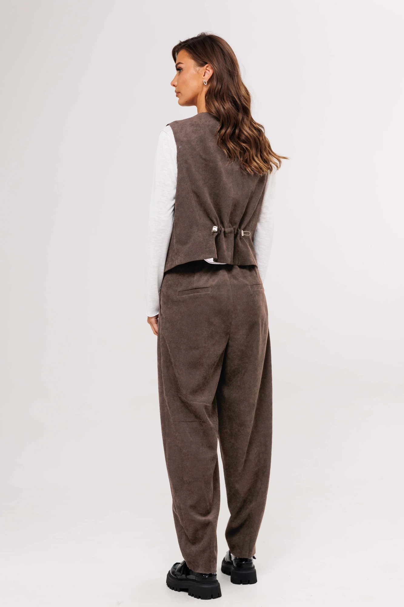 Костюм с жилетом - прекрасное решение для смелых экспериментов. Жилет полуприлегающего силуэта с асимметричной застёжкой, фигурной линией низа и регулирующийся кулисе по спинке. Полочки с отрезным бочком и нагрудными вытачками, спинки - с центральным швом, отрезным бочком и регулирующийся кулисой с фиксаторами. Брюки "баррел" на притачном поясе со шлёвками (эластичном в области спинки), с наклонными карманами , мягкими складками защипами по верху брюк и вытачками по низу. Джемпер трикотажный, с длинным рукавом, полуприлегающего силуэта.