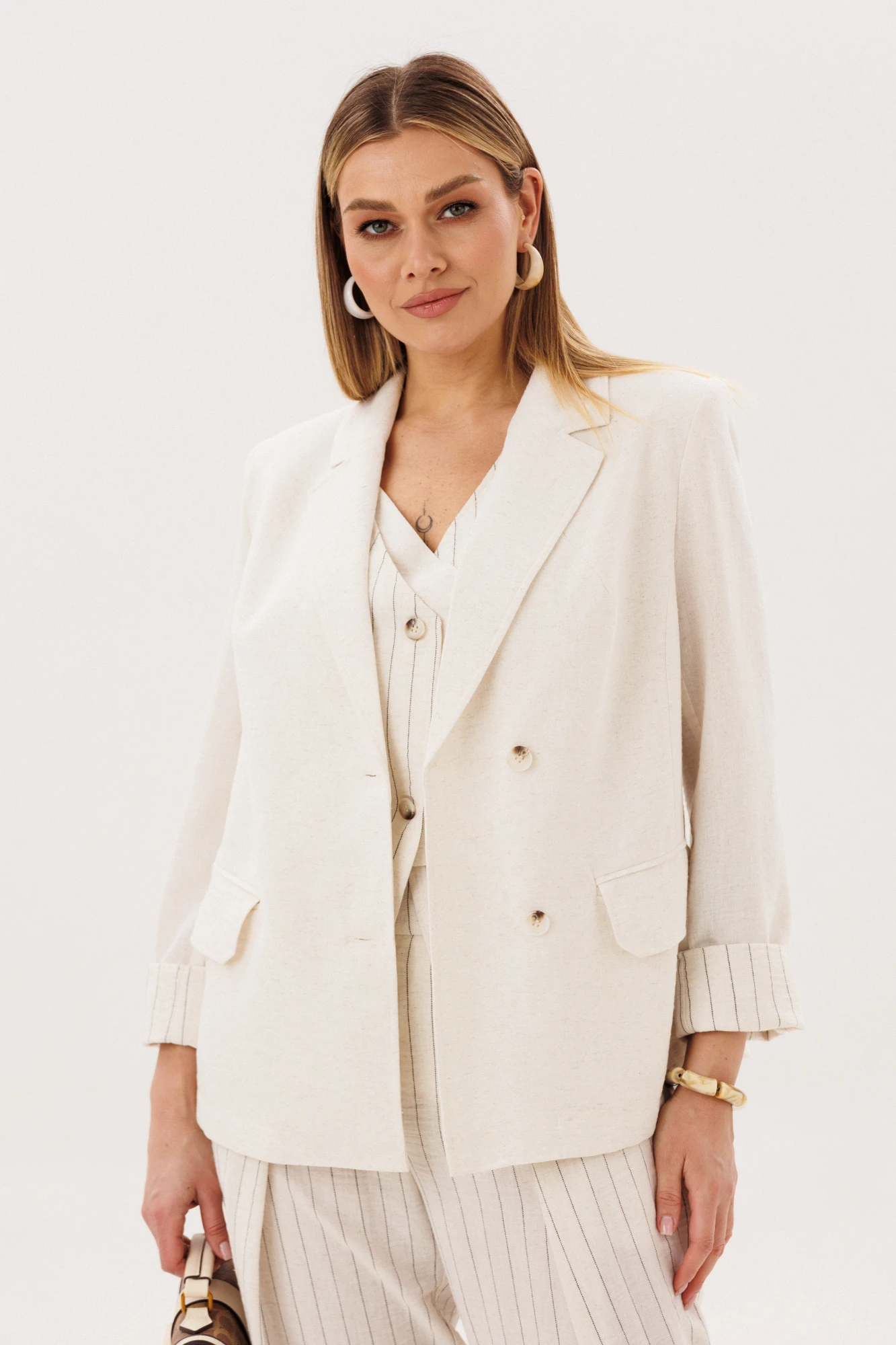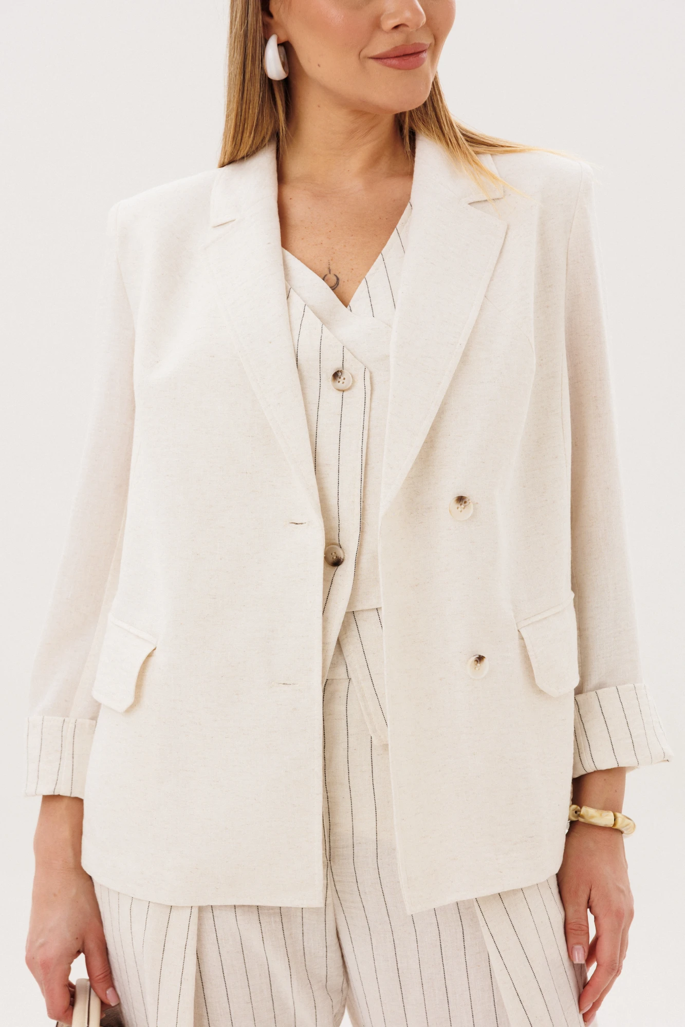 Однотонный жакет из смесовой ткани с добавлением льна гармонично дополняет комплект. Лёгкий, дышащий материал обеспечивает комфорт даже в тёплую погоду, а минималистичный крой делает образ сдержанным и элегантным.