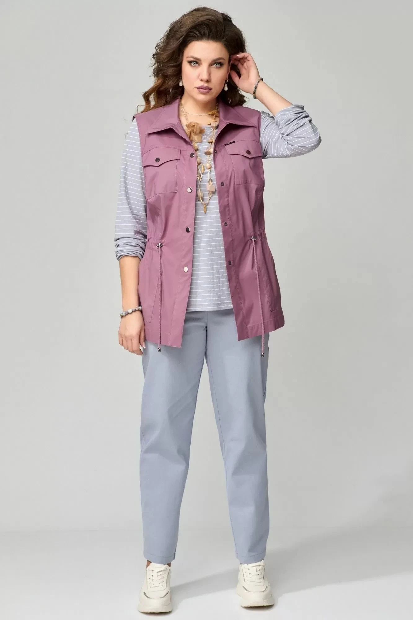 Комплект женский (жилет, лонгслив, джинсы) для повседневного образа. Жилетка прямого силуэта, без подкладки, по талии кулиса, воротник отложной, застежка однобортная, обработана отрезной планкой с кнопками. На груди жилетки два накладных кармана с клапаном, застегиваются на кнопку. Нижние карманы - накладные, вход в карман обработан обтачкой. по полочке - рельефы и кокетка. Спинка в жакете с рельефами и кокеткой, низ жилетки обработан в подгибку с закрытым срезом, проймы обработаны обтачкой. Лонгслив изготовлен из трикотажного полотна, прямого силуэта, рукав одношовный, низ обработан резинкой, горловина в лонгсливе обработана планкой, низ обраотан на распошивалке. Джинсы - брюки, зауженные к низу, с застежкой на молнию и пуговицы, в боковом шве - карман, по спинке пояса - резинка.