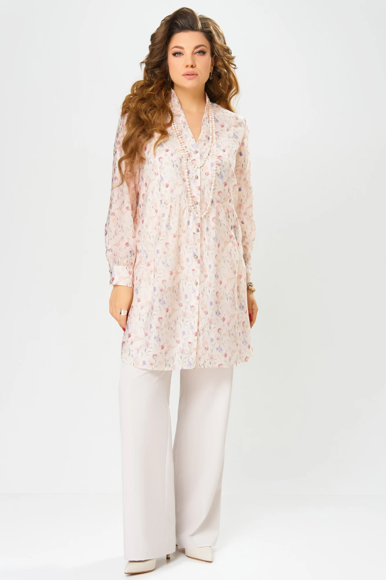 Туника, выполненная из воздушной ткани «Вуаль», покоряет изящным цветочным принтом и легкостью. Ее прямой силуэт обеспечивает свободу движений, а слегка прозрачная структура добавляет загадочности. Длинные рукава с притачной манжетой и застежкой на пуговицы позволяют регулировать длину, а фигурный вырез горловины с отрезными планками и воротник-стойка придают образу особый шарм. Фигурные карманы со сборкой на передней части добавляют стильные акценты, а изящные складки в области талии формируют женственный силуэт. Завершают образ фигурный низ с боковыми разрезами, придающий легкость движений.