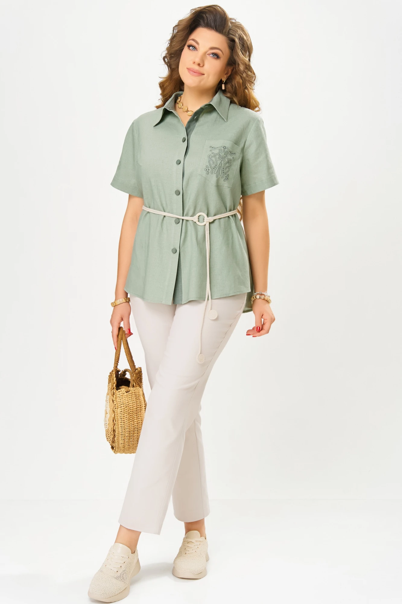 Блузка из льняной ткани с вискозой отличается легкостью и приятной текстурой, обеспечивая ощущение свободы и свежести. Ее прямой силуэт подчеркивает естественные линии фигуры, а однобортная застежка с отрезной планкой на пуговицах добавляет классический штрих. Воротник-стойка рубашечного типа придает аккуратность и изысканность, а нагрудная выточка обеспечивает идеальную посадку.