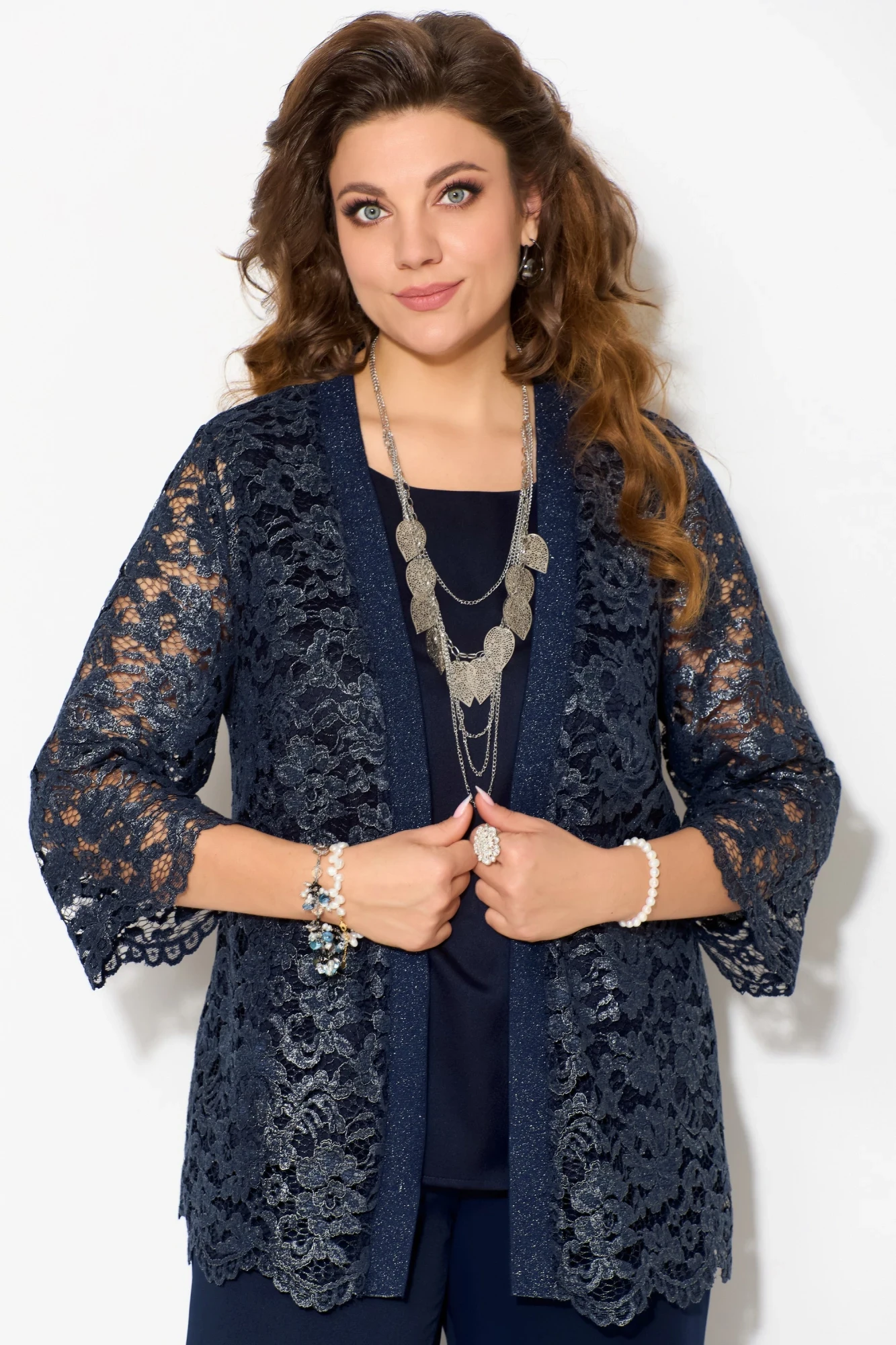 Кардиган выполнен из кружевной ткани прямого силуэта, без застёжки, край борта обработан довязом. Богатая и модная ткань, с легким переливом, придает изящности и модности. По груди кардигана выточка. По низу изделия и рукава - фистоны.