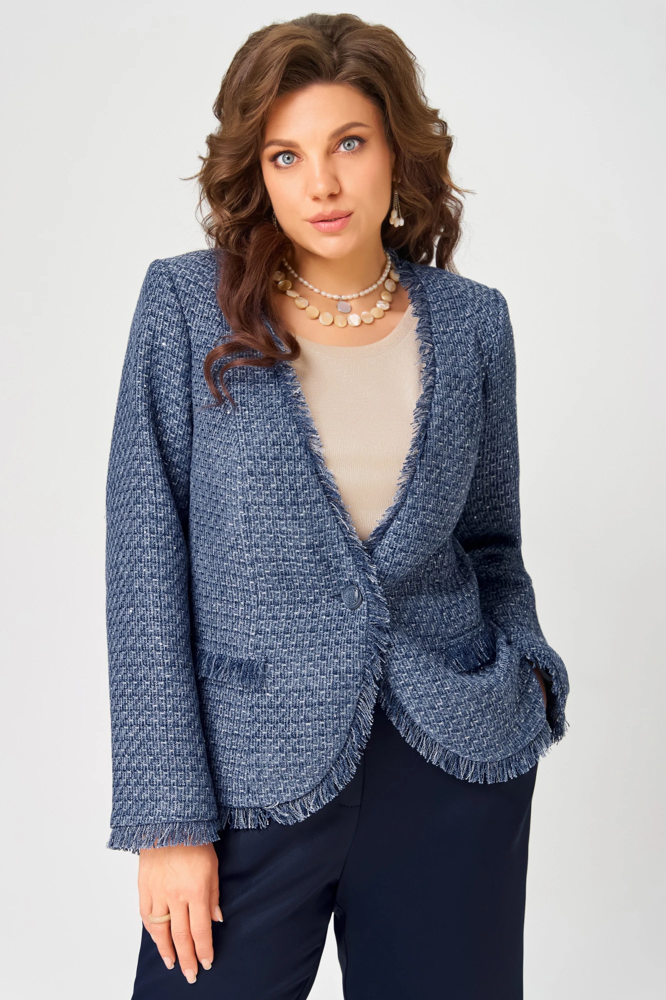 Жакет выполнен из твидовой ткани на подкладке полуприлегающего силуэта. Застежка в жакете однобортная на пуговицу, по полочке - рельефы, карман-обманка в виде настроченной трепки, по спинке рельефы. По краю борта и низа жакета вставлена трепка, рукав втачной двухшовный, по низу рукава вставлена трепка.