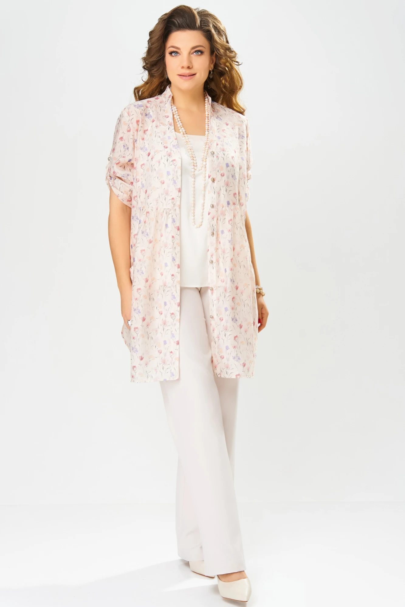 Туника из воздушной ткани «Вуаль» очаровывает нежным цветочным принтом и легкостью. Ее прямой силуэт дарит свободу движений, а слегка прозрачная структура добавляет загадочности и романтичности. Длинные рукава с притачной манжетой и застежкой на пуговицы позволяют регулировать длину, создавая вариативность образа. Фигурный вырез горловины с отрезными планками и воротник-стойка придают тунике особый шарм, а фигурные карманы со сборкой на передней части добавляют стильные акценты. Изящные складки в области талии формируют женственный силуэт, а фигурный низ с боковыми разрезами придает легкость движений.