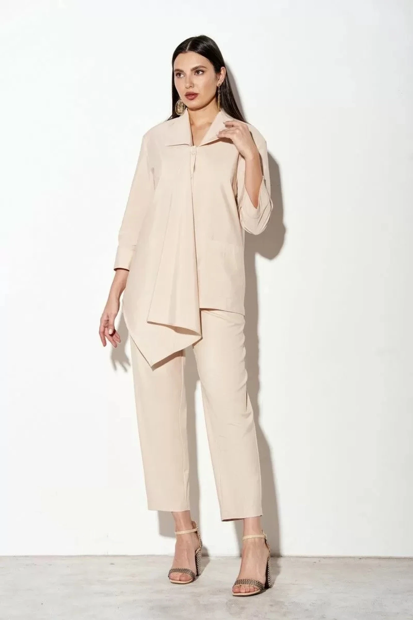 Костюм женский с брюками и рубашкой. Рубашка свободного силуэта со слегка спущенными втачными рукавами и рубашечным воротником выполнена из хлопкового поплина, застегивается на петли и пуговицы, на правой полочке декоративная отлетная деталь. Брюки "бананы" полуприлегающего силуэта с мягкими складками по переду заужаются к низу; пояс притачной с резинками по бокам; застежка на молнию, петлю и пуговицу; в боковых швах карманы.