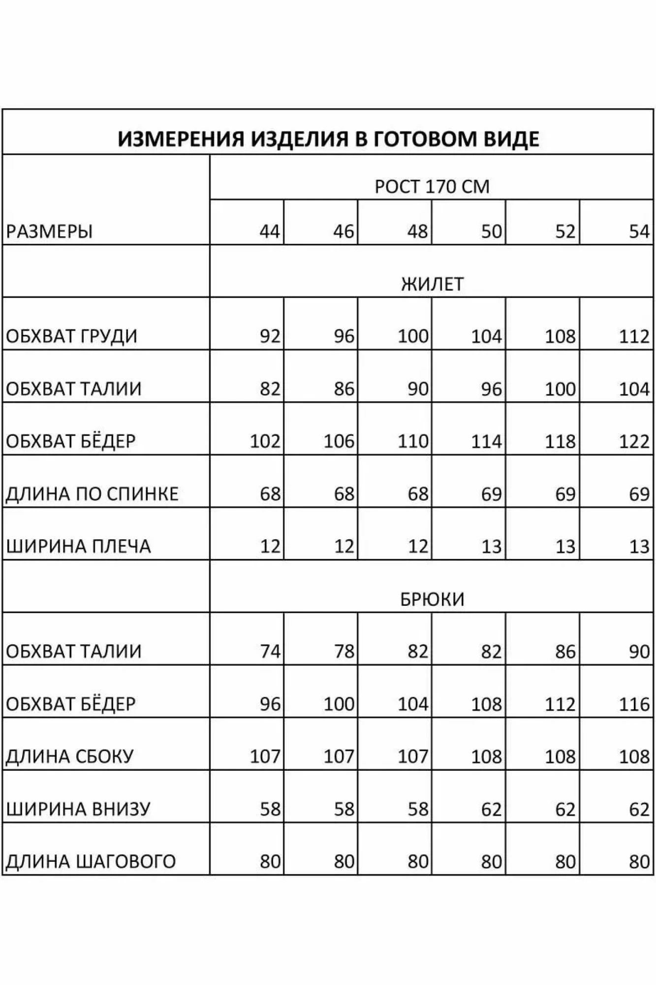 Женский деловой костюм, состоящий из жилета и брюк, выполнен из костюмной ткани высокого качества. Жилет классический двубортный полуприлегающего силуэта на подкладке с функциональными прорезными карманами по переду, воротником пиджачного типа и застежкой на петли и пуговицы. Брюки классические со стрелками полуприлегающего силуэта в области талии и бедер, прямые к низу. Брюки застегиваются на молнию, петлю и пуговицу.