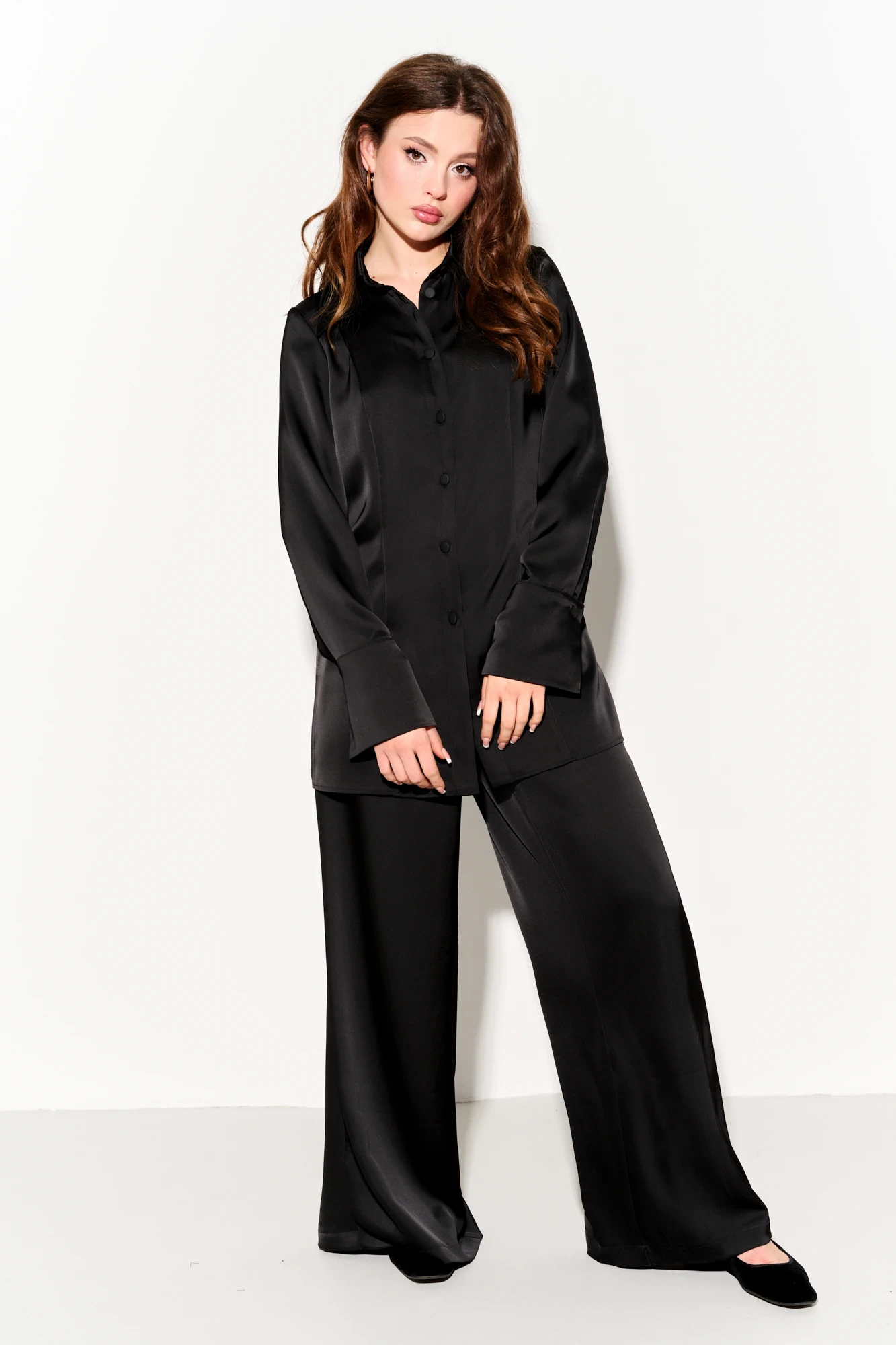 Женский костюм, состоящий из рубашки и брюк, выполнен из струящейся ткани с содержанием шёлка. Базовая женская рубашка полуприлегающего силуэта выполнена из струящейся ткани с содержанием шёлка. Рукава втачные с мягкими складками по низу рукава и высокой манжетой с одной функциональной пуговицей; по переду рельфы; воротник рубашечный; в боковых швах декоративные разрезы; застёжка по переду на петли и пуговицы. Классические брюки прямого силуэта с мягкими складками по переду и функциональными карманами в боковых швах; пояс притачной с эластичной тесьмой по спинке для лучшего прилегания; застежка на молнию, петлю и пуговицу. Костюм полностью соотвествует заявленному размеру. Пожалуйста, пользуйтесь таблицей замеров готового изделия. Уход: - при стирке в стиральной машине выбрать бережный либо деликатный режим; - температура воды не выше 40 градусов.Пожалуйста, пользуйтесь таблицей замеров готового изделия.