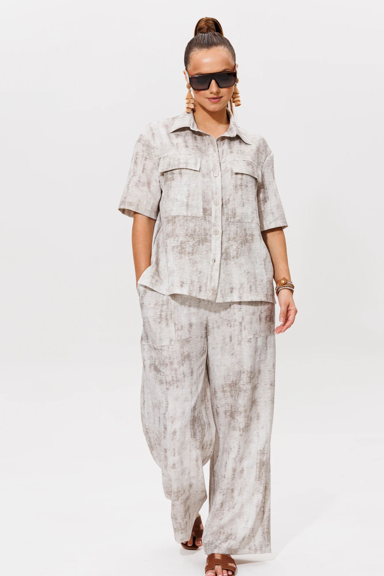 Яркий и  стильный комплект включает удобные брюки и свободную рубашку,что делает его универсальным выбором для повседневной носки или отдыха. Костюм выполнен из струящейся лёгкой ткани с добавлением вискозы.Рубашка прямого силуэта с воротником стойкой и застёжкой на петли и пуговицы.По переду имеются накладные карманы.В боковых швах имеются разрезы.Брюки прямого силуэта с резинкой по всей ширине брюк и декоративным шнурком. Также имеется накладные функциональные карманы.Большая подгибка позволяет "подогнать" брюки на любой рост.
