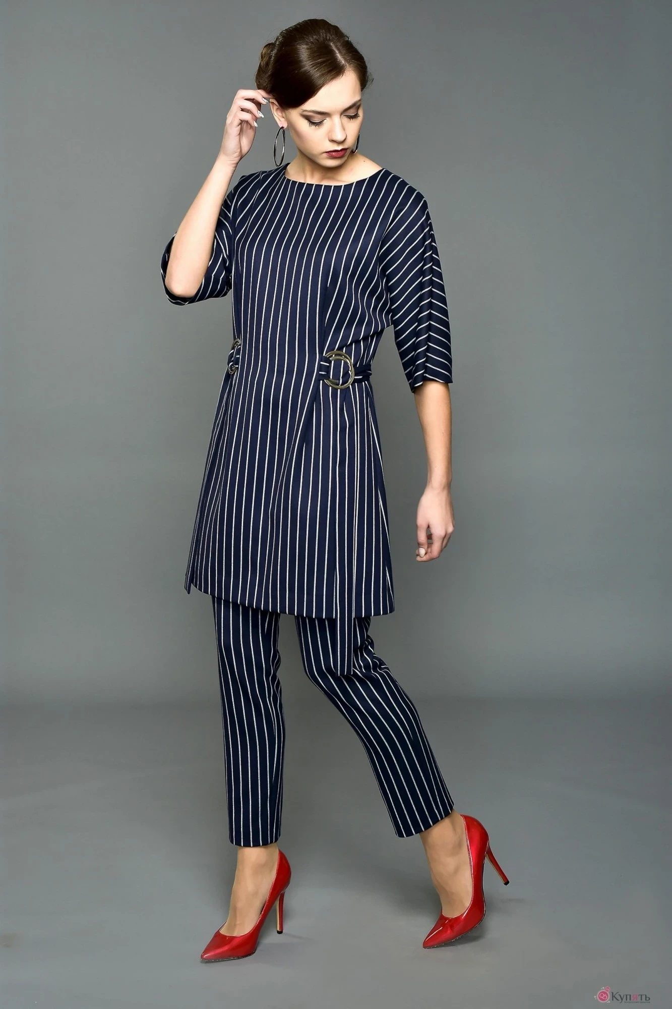 Комплект женский. Туника полуприлегающего силуэта. Рукав спущенный цельнокроеный, по переду в вытачки вставлены кольца, куда продет пояс. Брюки классического силуэта зауженные к низу.